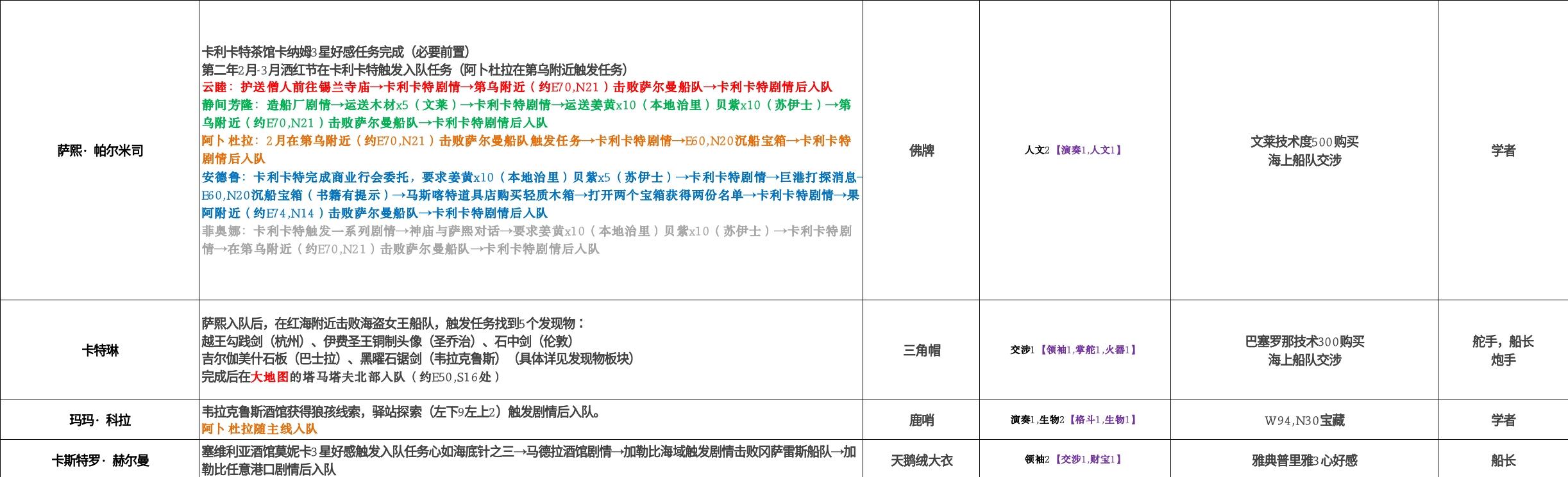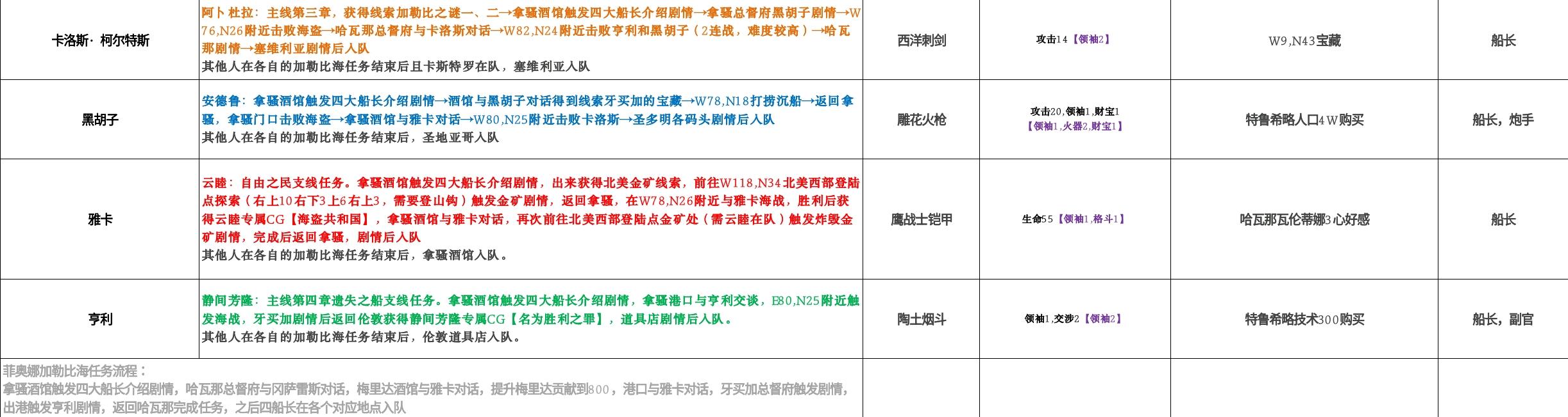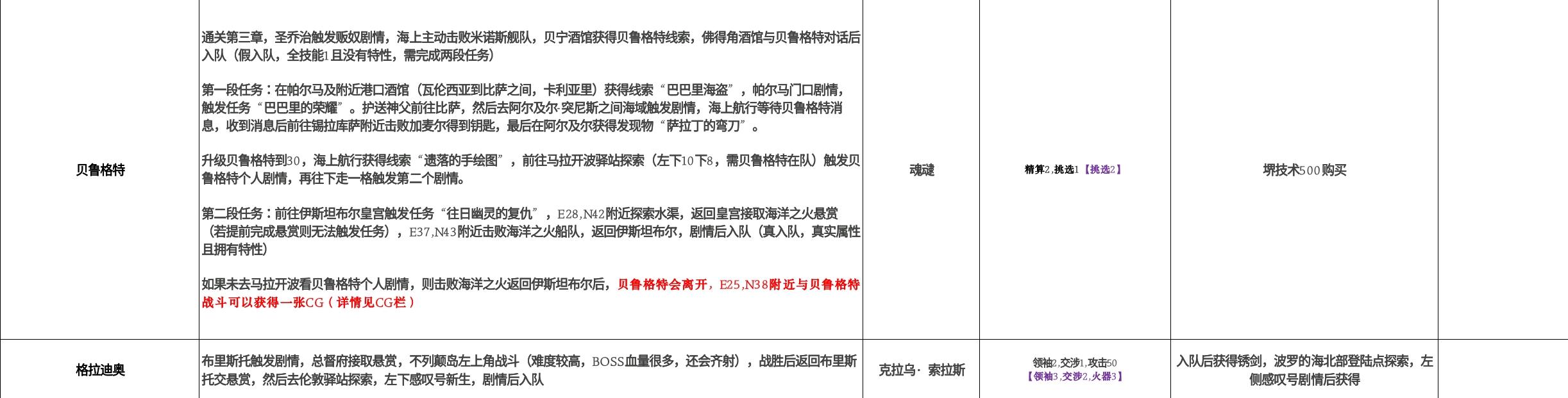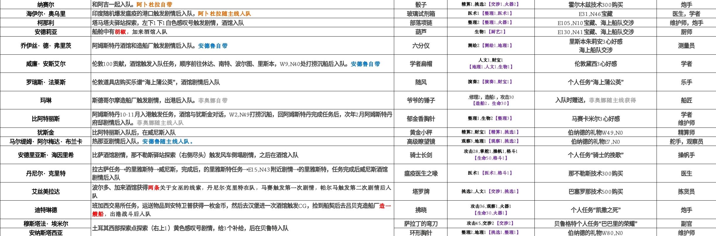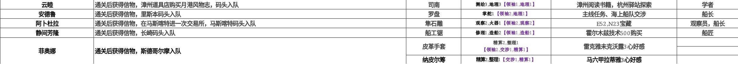 表格从左到右顺序为:名字、入队方法、专属装备、效果、专属装备获取方式、角色建议职业。