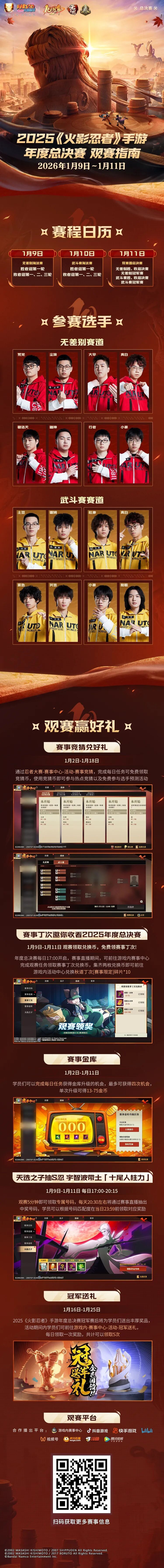 2025《火影忍者》手游年度总决赛今日开赛,无差别淘汰赛率先打响,明日(1月10日)进行武斗赛淘汰赛,1月11日的双赛道总决赛将决出双赛道最终的冠军归属。赛事期间,参与赛事活动即可获得全新赛事限定忍者秋道丁次「赛事限定」、金币、赛事限定道具等丰厚游戏道具奖励,更有机会获得全新高招S忍宇智波带土「十尾人柱力」,豚豚已经帮大家把活动详情整理到下方图片啦,滑动查看即可了解~