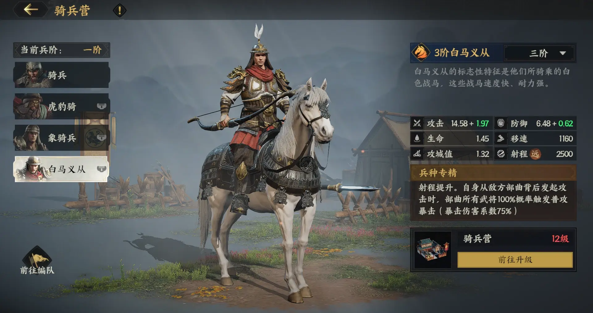 白马义从这个兵种我最近用得比较多,作为目前唯一的远程骑兵,手长加上跑得快,拉扯起来真的舒服。我最常用它去偷袭对面烽火台——面对移速慢的盾兵或者比较脆的弓兵队伍,基本可以拿很多武勋。