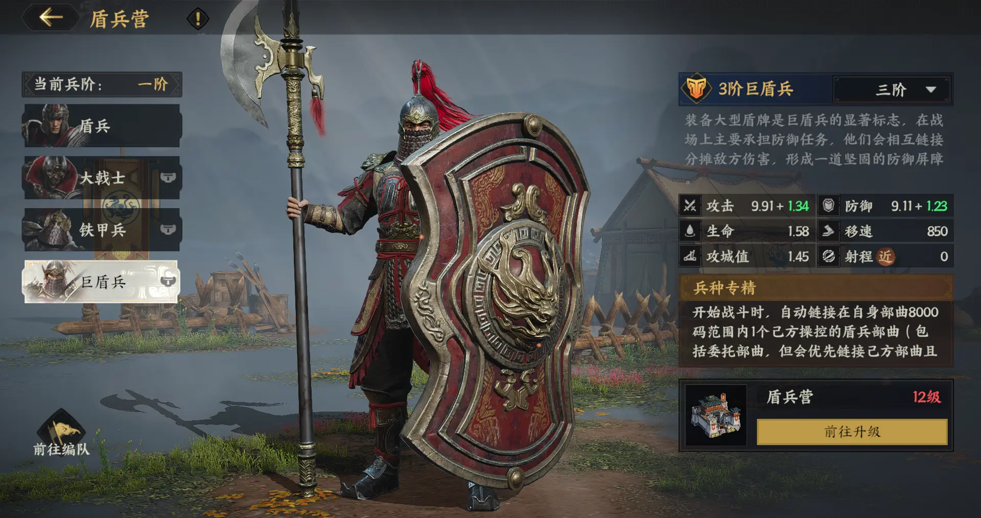 巨盾兵主要在大规模团战里出场。如果正面要扛白马义从或者弓兵这类远程火力,我习惯让巨盾兵和铁甲兵配合,扛伤效果更好。要是放在后排专门防虎豹骑、象骑兵切进来的话,第二队我更推荐配大戟士,拦冲阵的效果更稳。