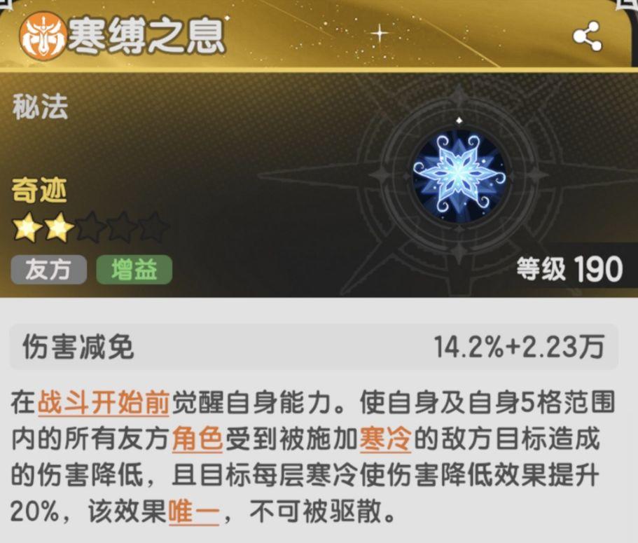 寒缚之息:范围减伤技能,和神魂庇佑极像,但范围大1格,且上限极高,不朽达到20%减伤,把对面挂满十层寒冷就是60%群体减伤,非常有开发前景。