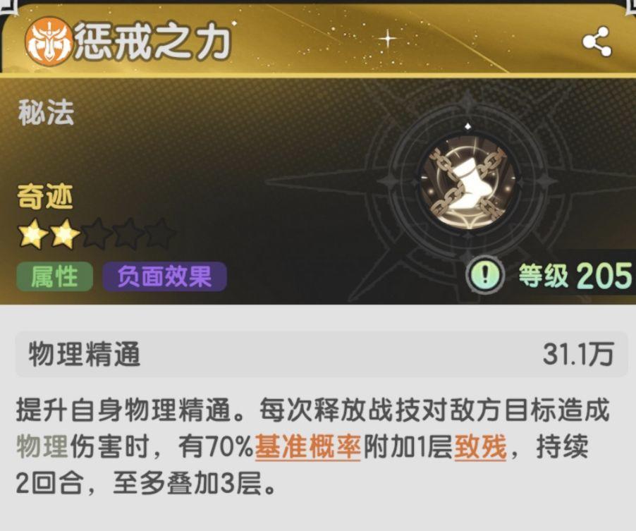 惩戒之力:可以把别人腿打瘸的技能,加一定的物理精通。偏功能性的技能且和神恩蓄锐一样不吃品质,在特定情况下可以无限制拉扯斗士和骑士。致残:(每层降低25%移动力和10%速度,最多三层持续两回合)移动力:每回合都能走4格,砍25%移动力就只能走3格,最高75%也就是对面一回合只能走1格然后罚站。