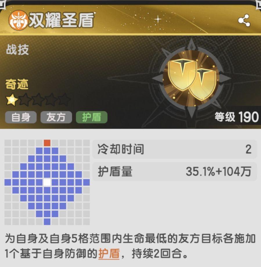圣耀双盾:就是危情守护的升级版,可以同时给自己和队友套盾且范围更大,数值还行,本来在高压本还有一席之地的,但现在护盾被砍成垃圾了,也是仓库吃灰的技能。