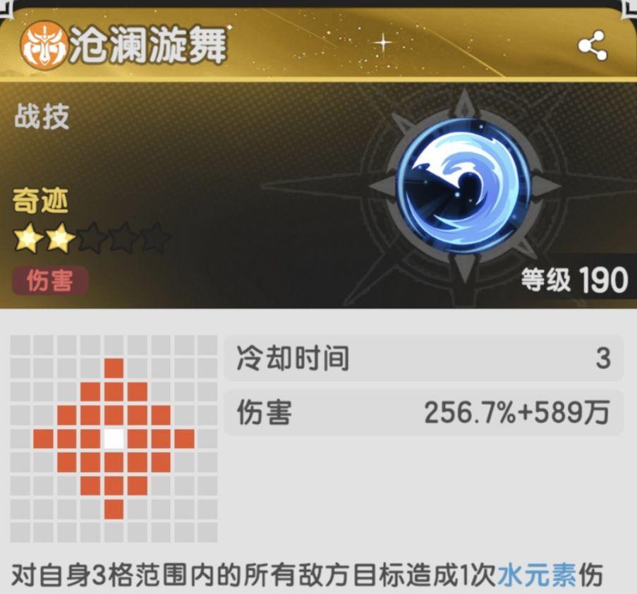 沧澜漩舞:就是四转的两个涡流技能放大版,伤害一般,cd还3回合,既然非要换皮,多给点数值也行啊!