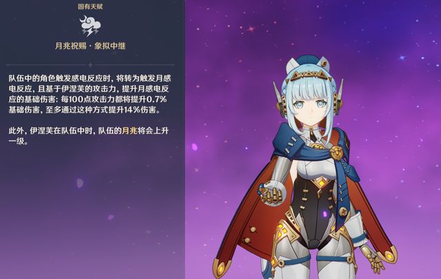 先说伊涅芙,她是一名月感电增伤拐,兼后台盾辅、副C,倚靠她的被动天赋,能够让加入她队伍的水雷角色,将普通的感电反应,直接升级成能够暴击的月感电反应。