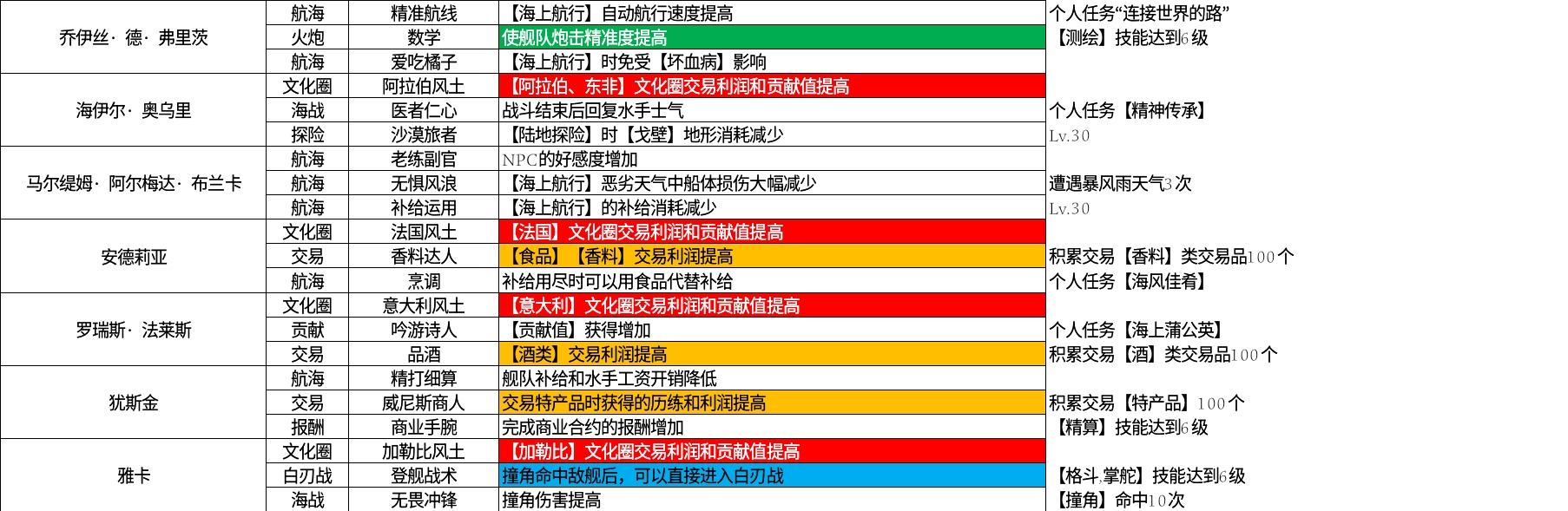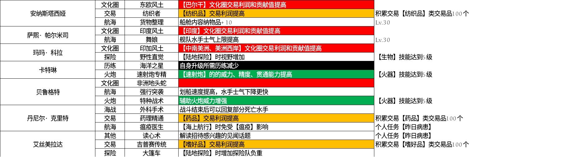 表格从左到右顺序依次为:角色名字、效果分类、特性名称、特性效果、解锁要求。