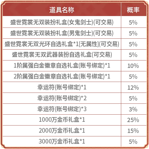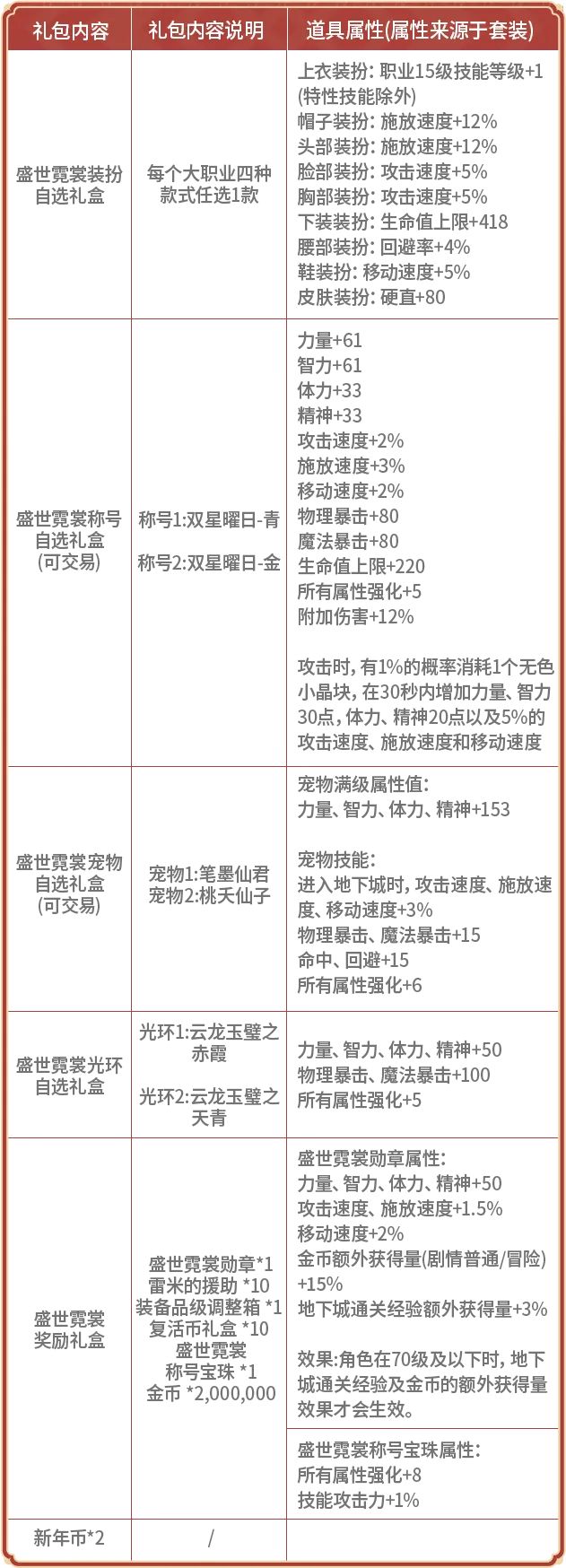 另外,2个新年币兑换的盛世霓裳特别宝箱内,有10%的概率可以抽到男/女鬼剑的隐藏款无双装扮(可交易,天空套属性),有5%的概率可以抽到盛世霓裳无双武器装扮(可交易,与盛世霓裳武器装扮同属性,限男/女鬼剑)。