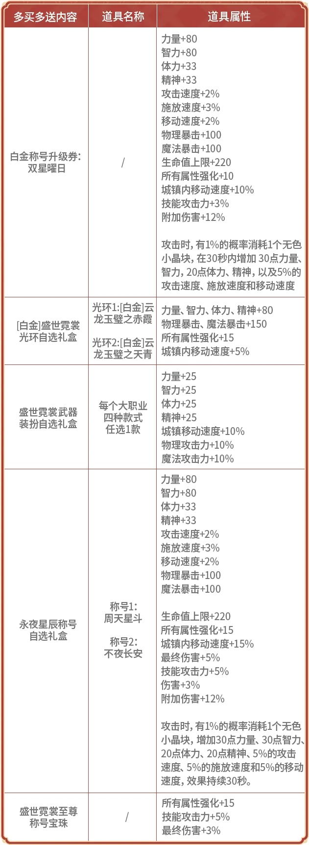 1、多买多送白金/至尊道具属性 春节的白金称号新增了技攻+3%的加强,再加上礼包内有新的称号附魔宝珠,如果预算有限的话就不推荐拿第6套的称号跨界石了,直接给小号换新的白金称号并附魔新的(白金)称号宝珠即可;白金光环的属性则保持不变。