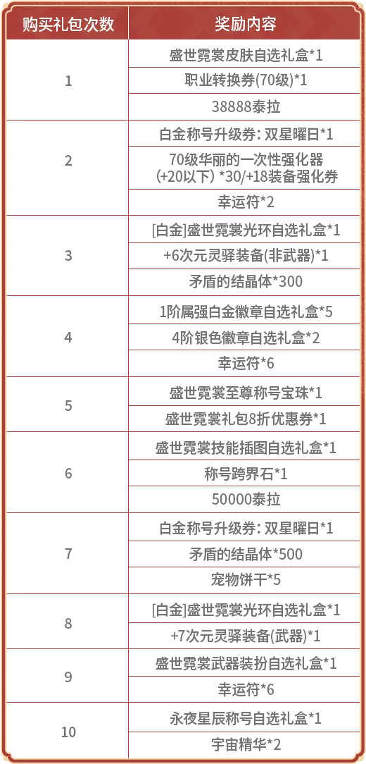、职业转换券*1、38888泰拉、70级华丽的一次性强化器*30/+18装备强化券、+6次元灵驿装备(非武器)*1、矛盾的结晶体*300、1阶属强白金徽章自选礼盒*5、4阶银色徽章自选礼盒*2、幸运符*6)