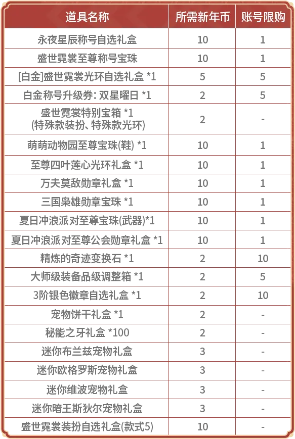 2、新年币兑换商店更新 除了新的春节双尊都可以以10个新年币的价格兑换外,往期礼包的至尊道具(至尊鞋宝珠、至尊光环、至尊勋章、至尊勋章宝珠、至尊武器宝珠、至尊公会勋章)也都可以以10个新年币的价格进行兑换。