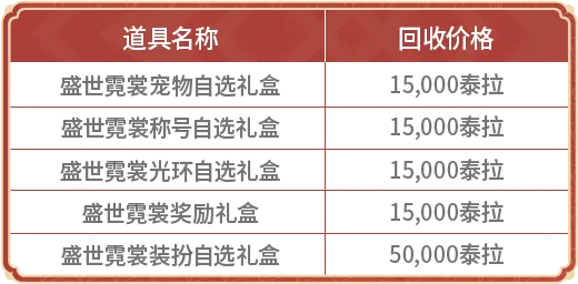 奖励在方案①的基础上多1个称号跨界石、盛世霓裳技能插图自选礼盒、5万泰拉以及1套未开启的新春礼包(上架拍卖行预估能再回血30万泰拉)。