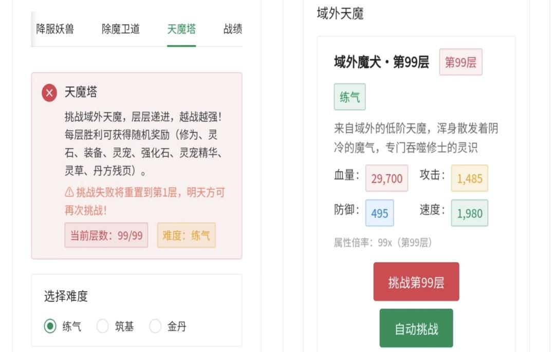 4)天魔塔:炼气、筑基、金丹,目前开服三个境界每个塔层数为99,层数越高奖励越高每层按倍率增加奖励。