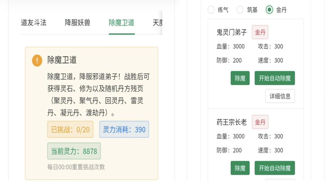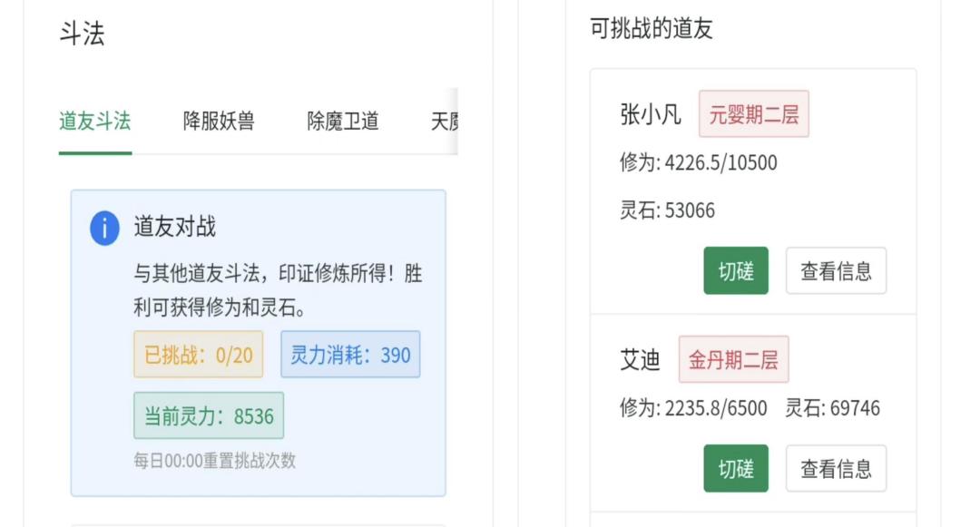 1)道友斗法:消耗少量灵气,挑战其他道友,获胜可获得修为与灵石(每日必做20次)。