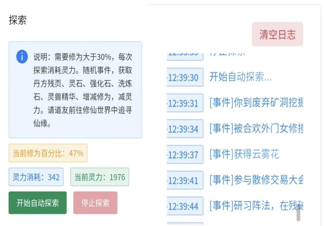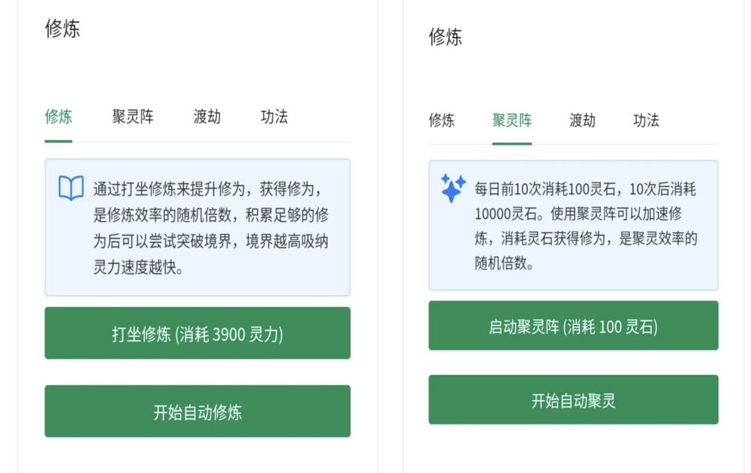 1.基础修炼:灵气(每10秒获取一次)→修为,消耗一定灵气修炼打坐提升修为。