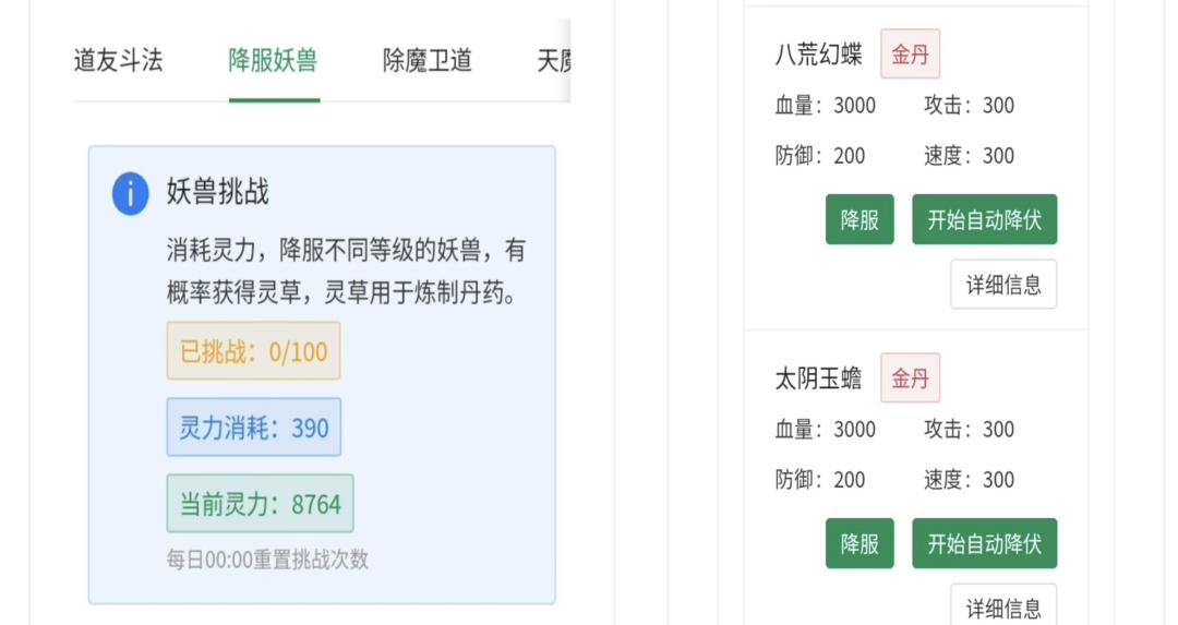 2)降服妖兽:消耗少量灵气,挑战获取奖励,是炼制 丹药获取灵草的主要途径。