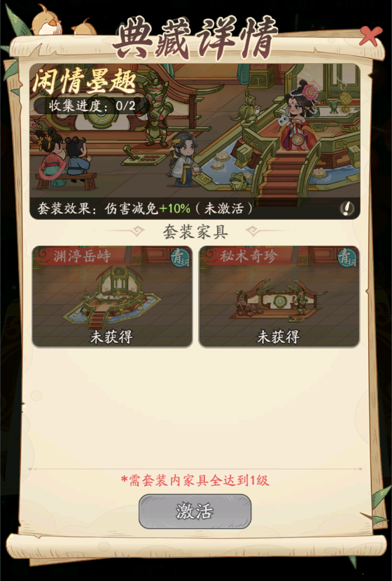 族长若同时拥有家具【秘术奇珍】和【渊渟岳峙】,即可解锁套装效果【闲情墨趣】,助力族长名士对战!