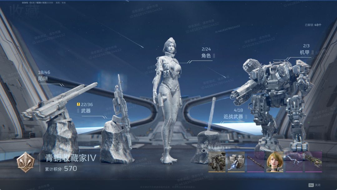 从左往右分别是陷阱收藏、武器收藏、角色收藏、近战武器收藏及机甲收藏;逆行者们每拥有该5系列收藏中的任意永久,都将增加“积分”,该积分可以作用于里程碑奖励的领取;在该界面的右下角将显示近期获得的可计入收藏积分的道具,可点击右下角的道具图标查看详情。