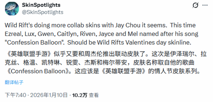 爆料:《LOL》手游将再次和周杰伦联动推出告白气球系列皮肤