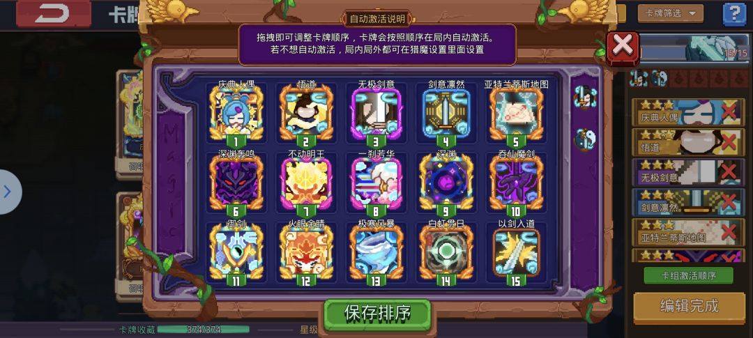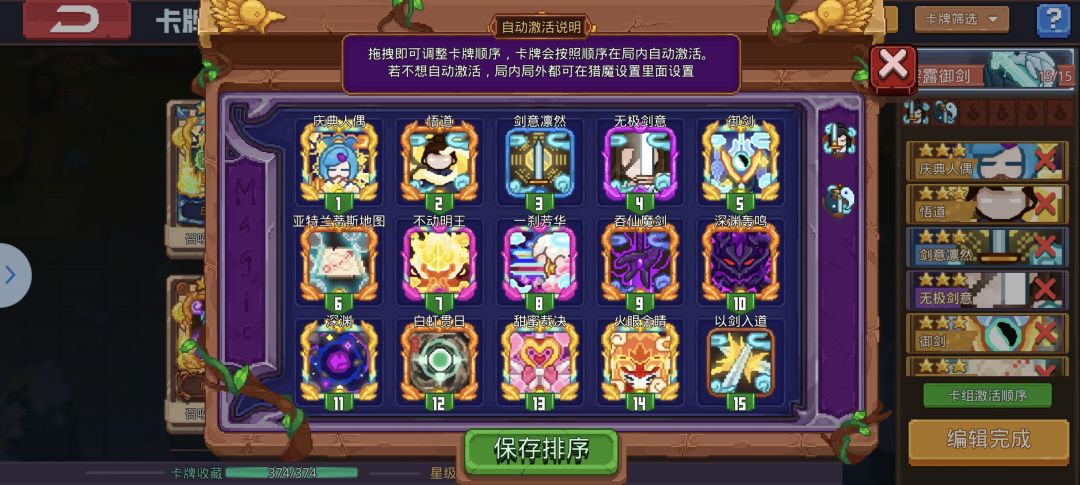 剑来:可以给一把剑,以免开局无剑。释放技能也能叠一些剑意。魔印激活4张仙卡触发额外效果。