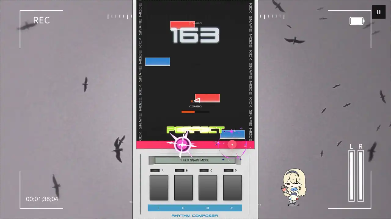 - B:跟随[下落横条]按下空格,瞬切【鼓机模式】:化身节奏心脏。屏幕瞬间化为经典两步鼓机音序器!用底鼓与军鼓,亲手编排、敲击出驱动整首曲目的核心节奏骨架。