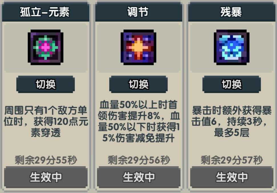 ③每秒获得3%全属性伤害,最多90层,死亡清零(复活后有惩罚机制,10秒内全属性伤减少50%,4格虚空能量可让惩罚机制减半)