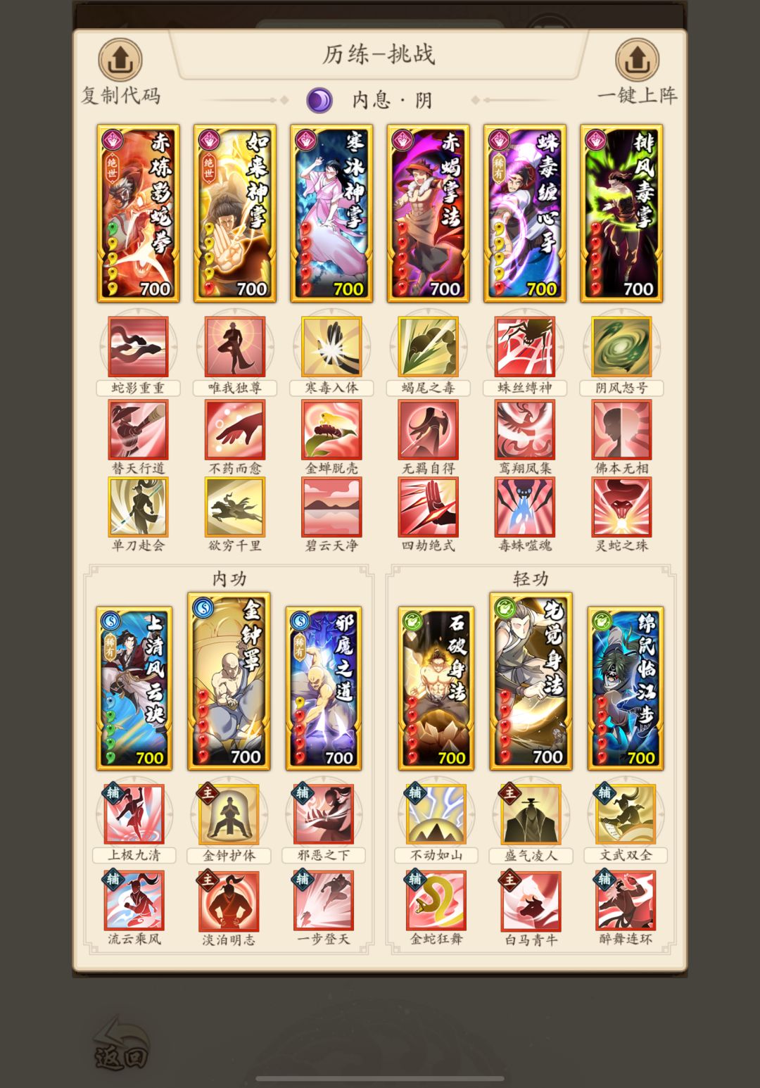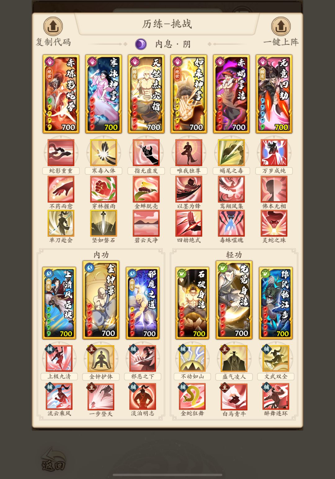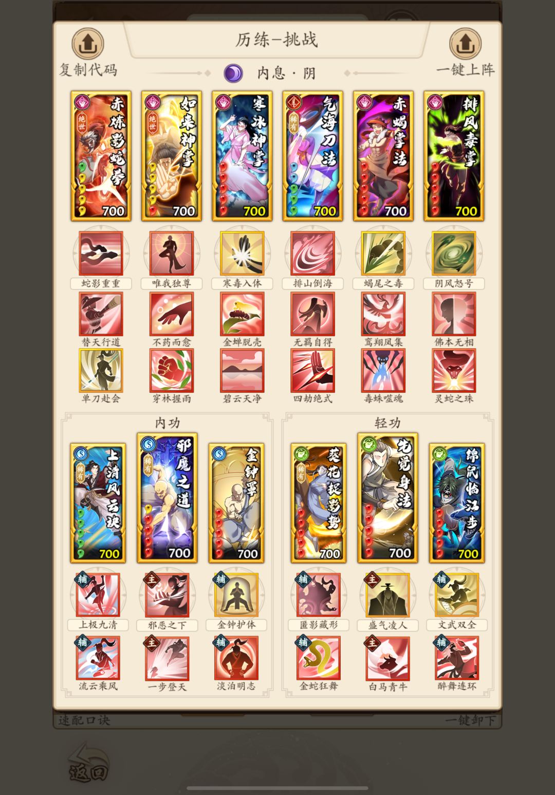 稀有方面没什么疑问,配流云的上清是绝对的t0卡,且正好替换触发率感人的大蓁兰真经。绝世方面展开说说,看目前的发展,阴拳如果后续不在dot方面加新东西,那么极有可能向着招伤方面转型,招伤流派北斗是绝对的核心卡。考虑到到这个阶段如来大家应该都已经拉红最次也拉黄了,就不再考虑,蛇拳以及扇子的话因为dot流强度滑落优先级也要往下调整。重点说说游龙的情况吧,由于我们的攻略是面向平民玩家,实际上我个人是不建议拉游龙的,阴拳不比阴刀调和刀外功卡面的减伤效果,因此还是相对依赖主运轻功的勾数的,游龙养成周期长、地武不产出且是气势位置,不敢保证等到一年半载后拉起的时候会不会沦为版本迭代的牺牲品,这是我个人的观点,当然游龙的强度还是有目共睹的,如果下定决心要转也是可以的。然后无名掌法的话是与游龙配套的卡,咱不考虑加入平民阴拳体系,一方面养成成本高,另一方面平民阴拳目前还是打一轮爆发,不具备打长轴的能力。