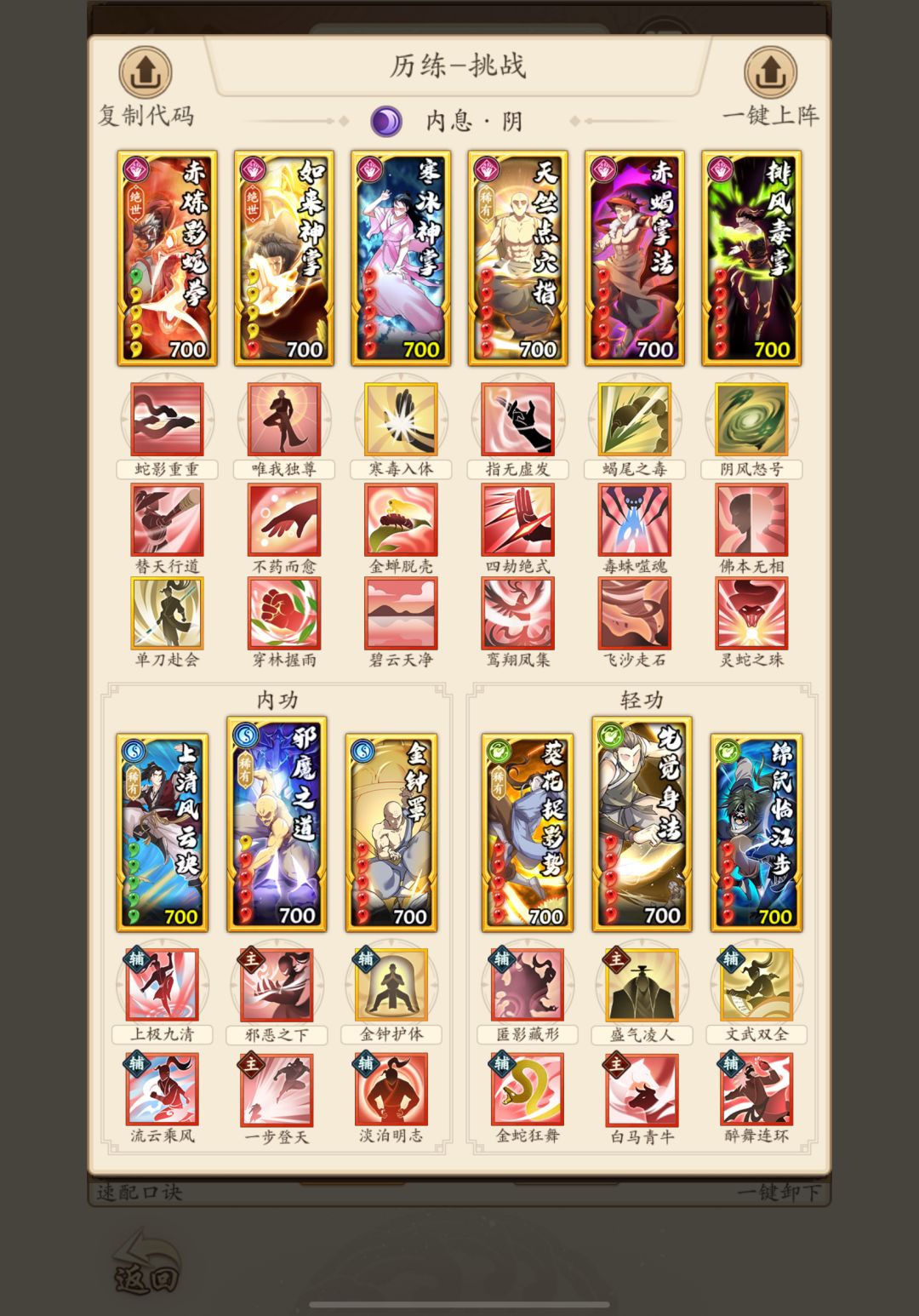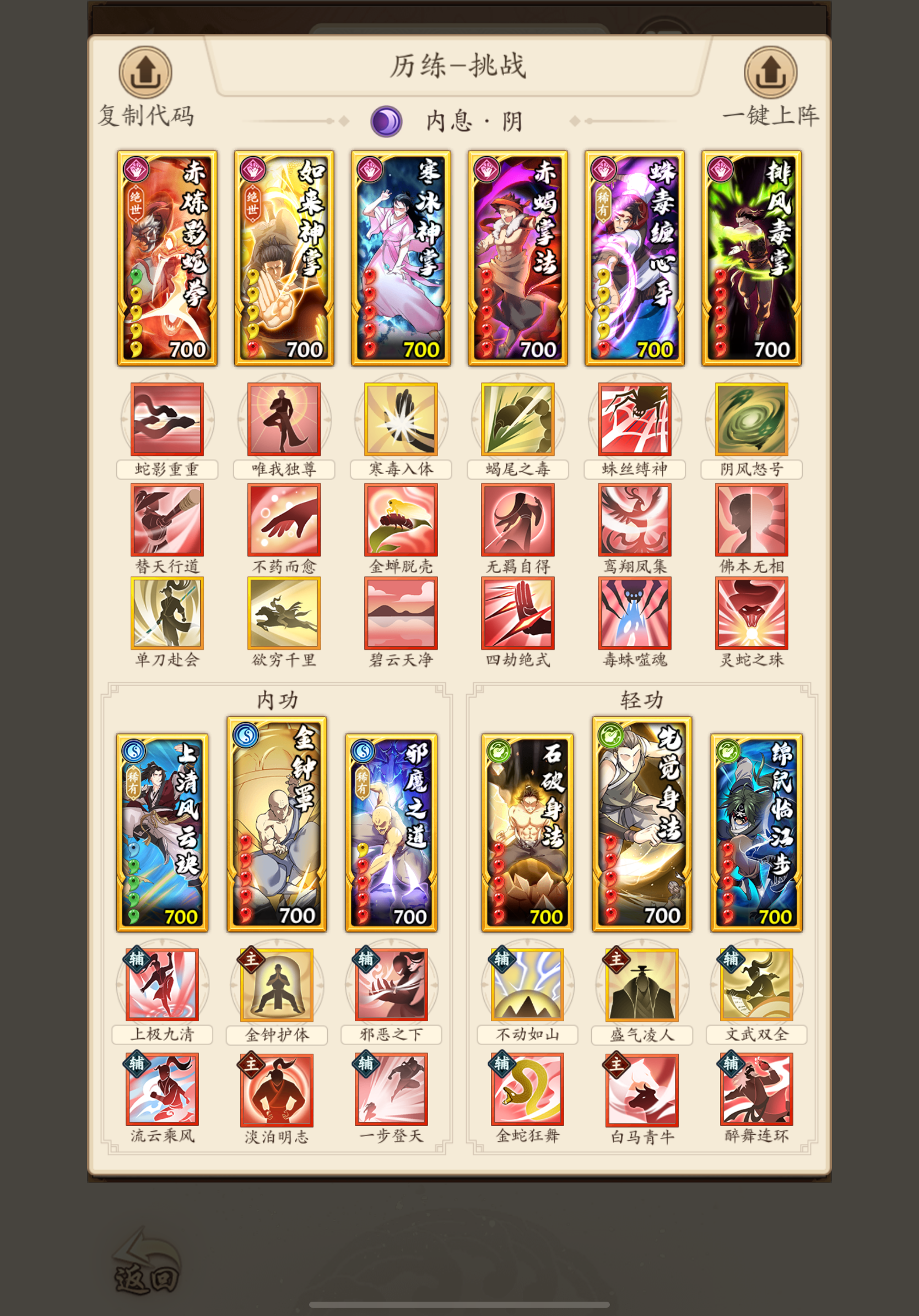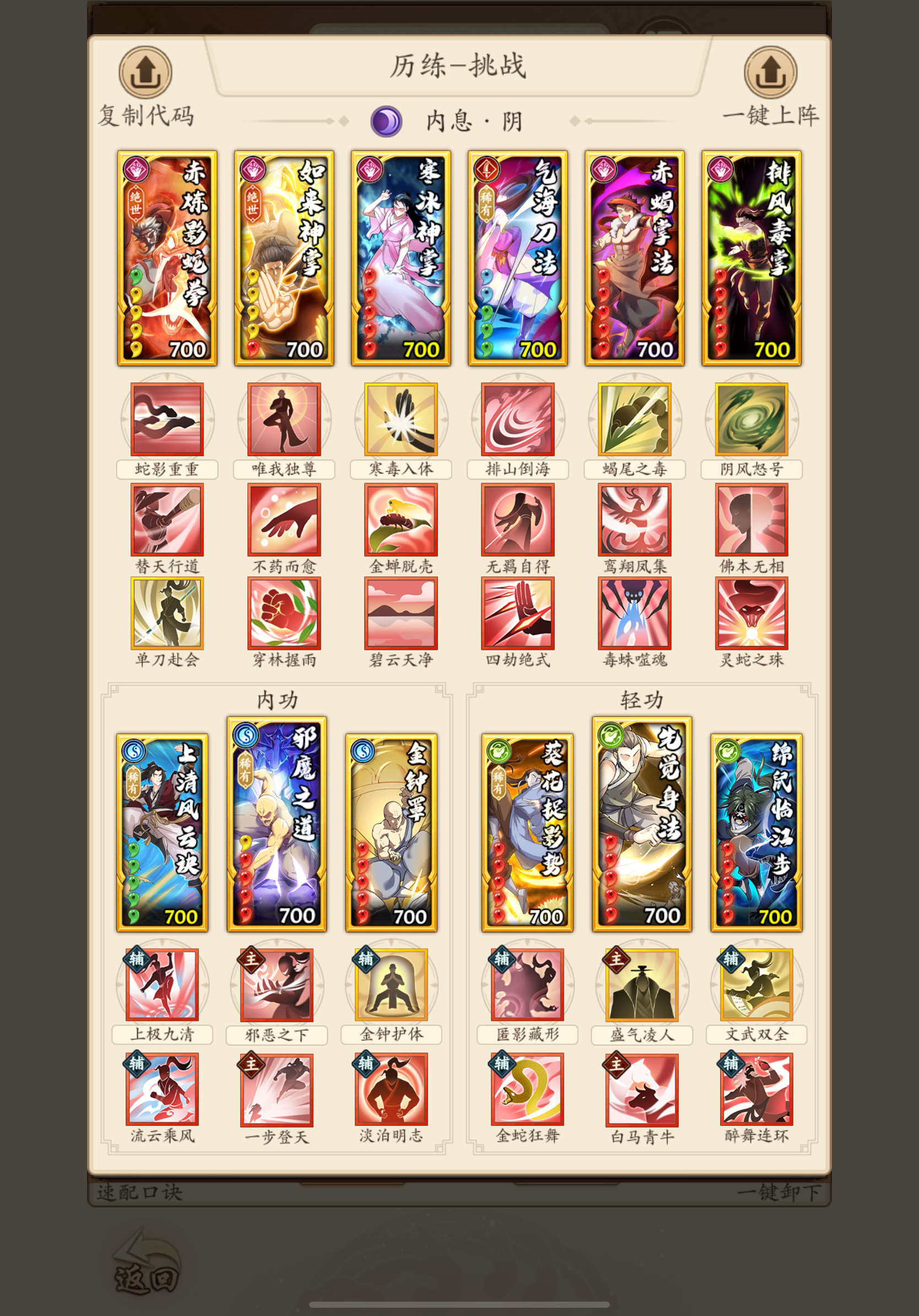 如果速度特别慢,该招式组点穴也适用,速度正常不要带无羁自得,点穴加无羁可能会过掉第五张牌,吞掉后手爆发。另外,如果缺伤害,请在第二张图的基础上,把无羁自得替换为以墨为锋。