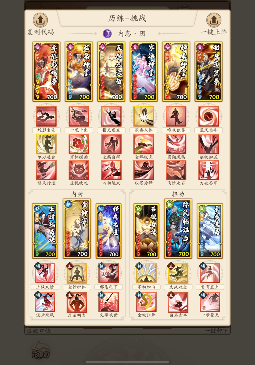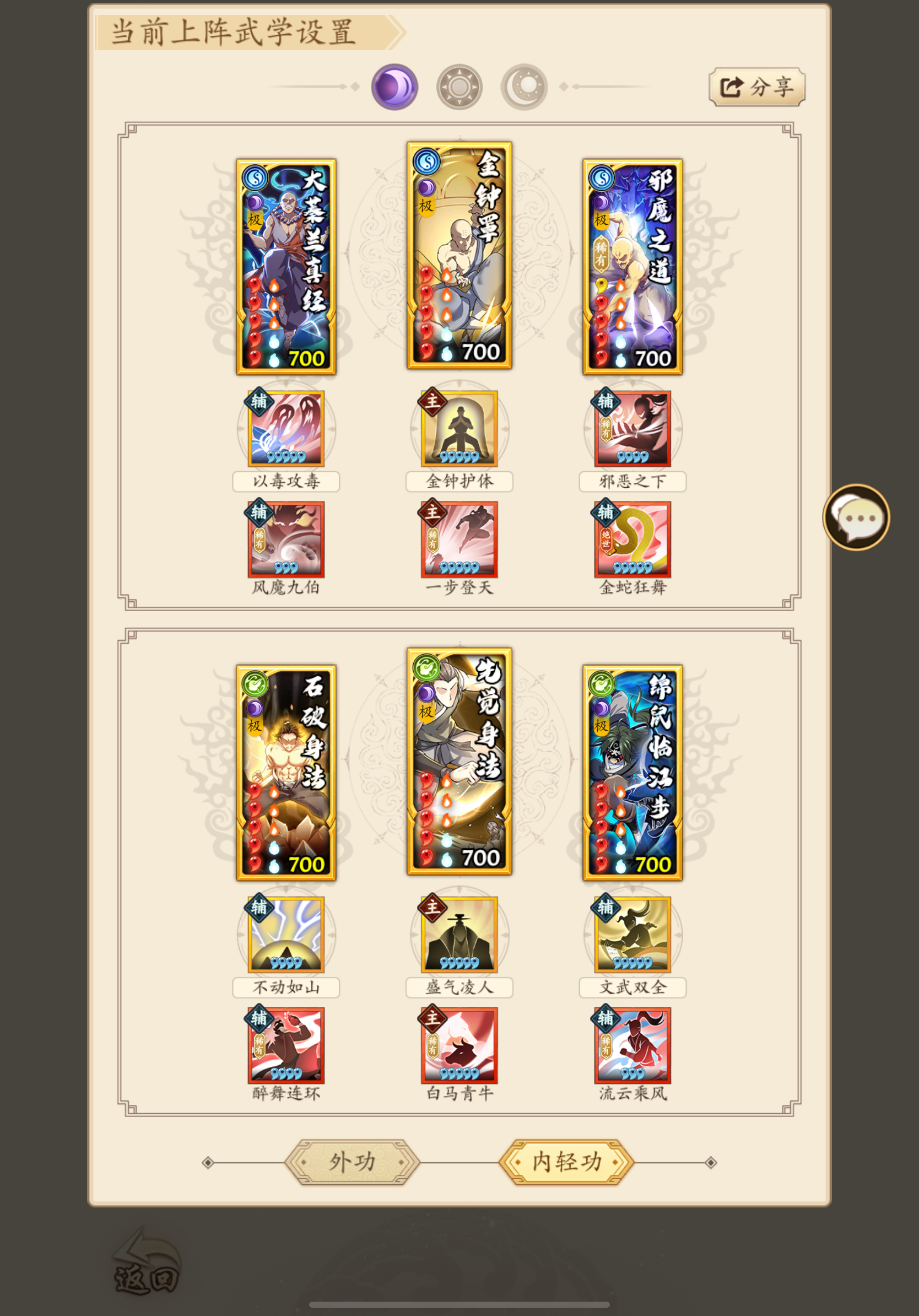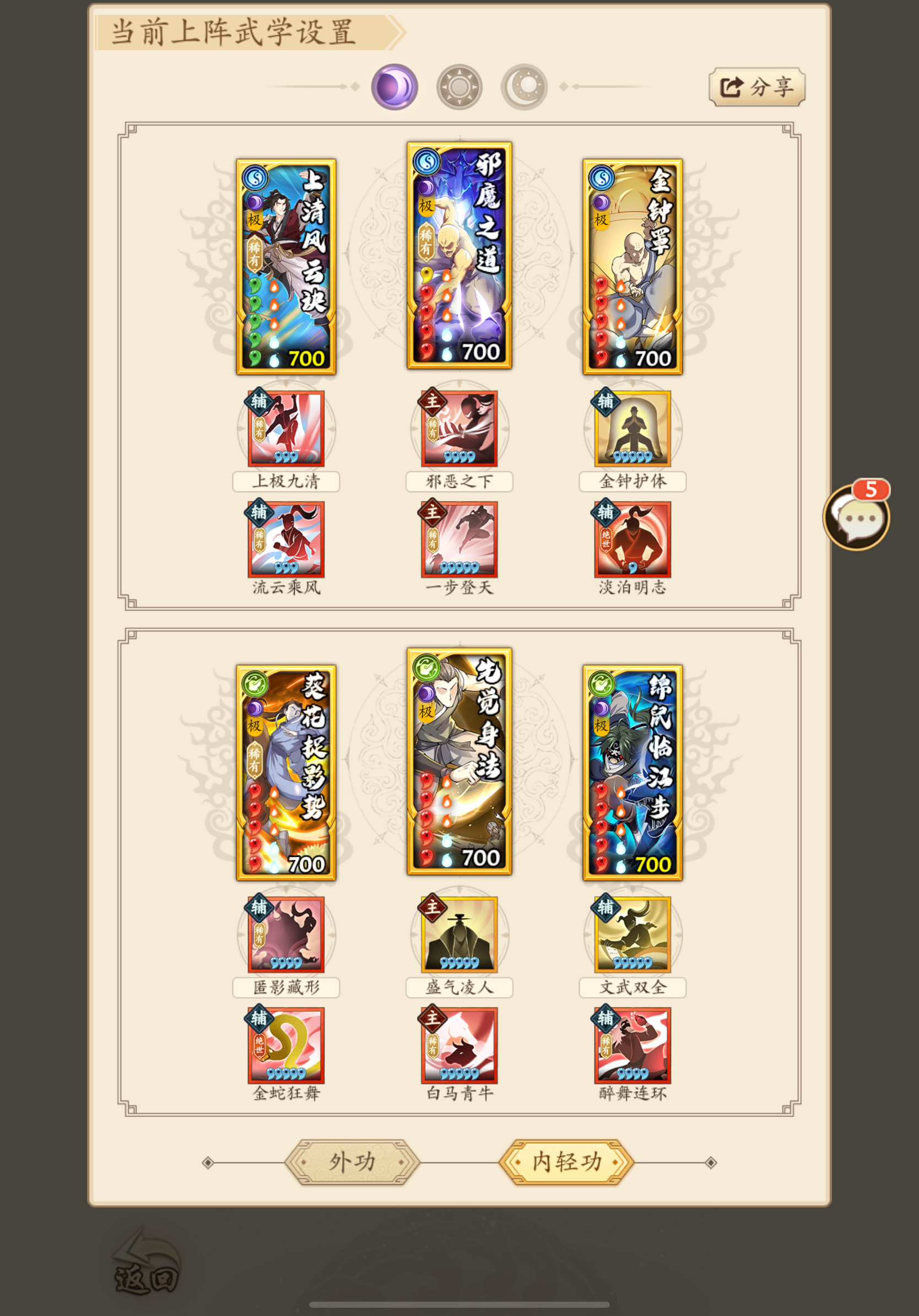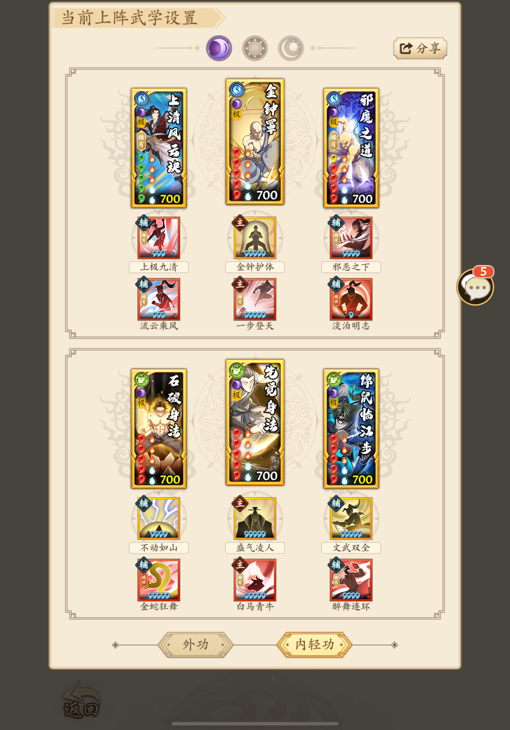 总的来说,带淡泊就建议带上清流云,流云不管主运辅运,至少搭配两个高概率运功,基础概率最少在35%+。缺点是怕开局气海,如果开局气海特别多还是把风魔带上吧,可以主个祥龙潜龙之类的,就不要带流云了,不带流云的话醉舞也就不强制带了。后面的两组阴拳都可以用这样的模板,到时候就不展开说内轻的替换了。↓完整配招继续往下翻。