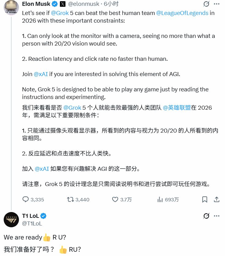 网友将矛头指向Grok-5,并非空穴来风。马斯克团队早已宣布,Grok-5将在今年参与电竞表演赛,且为比赛设置了严苛的“人类枷锁”——不能直接读取游戏数据,需通过摄像头像人类一样捕捉视觉信息,APM(每分钟操作次数)和反应时间也被限制在人类职业选手范围内。这意味着,Grok-5需要突破的不仅是游戏操作的天花板,更是从视觉感知到策略决策的全维度考验。而韩服高分段的实战训练,正是其打磨视觉识别、团战协作、临场应变能力的最佳场景。毕竟,《英雄联盟》作为多人协作的复杂博弈游戏,与AlphaGo的完美信息博弈不同,它充满了视野遮蔽、战术欺诈等不确定因素,需要AI在信息不完全的情况下做出精准判断,这正是Grok-5需要攻克的核心难点。