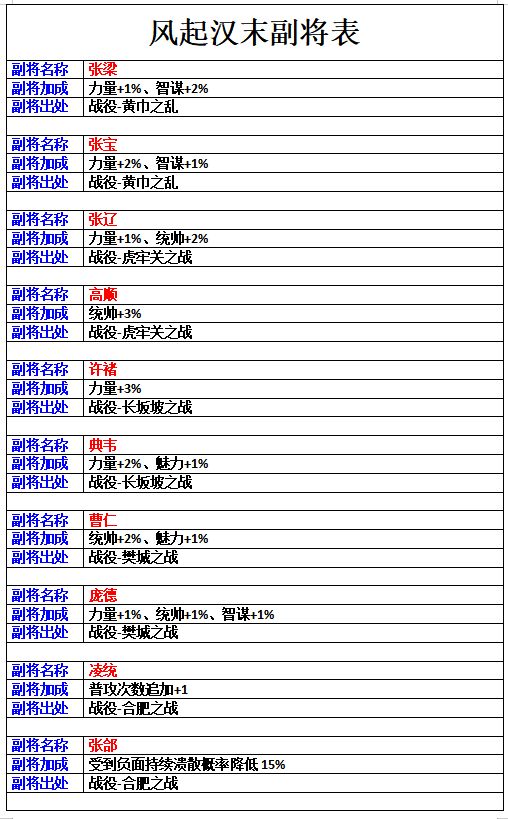 风起汉末-1.2.2版本全新副将-副将表