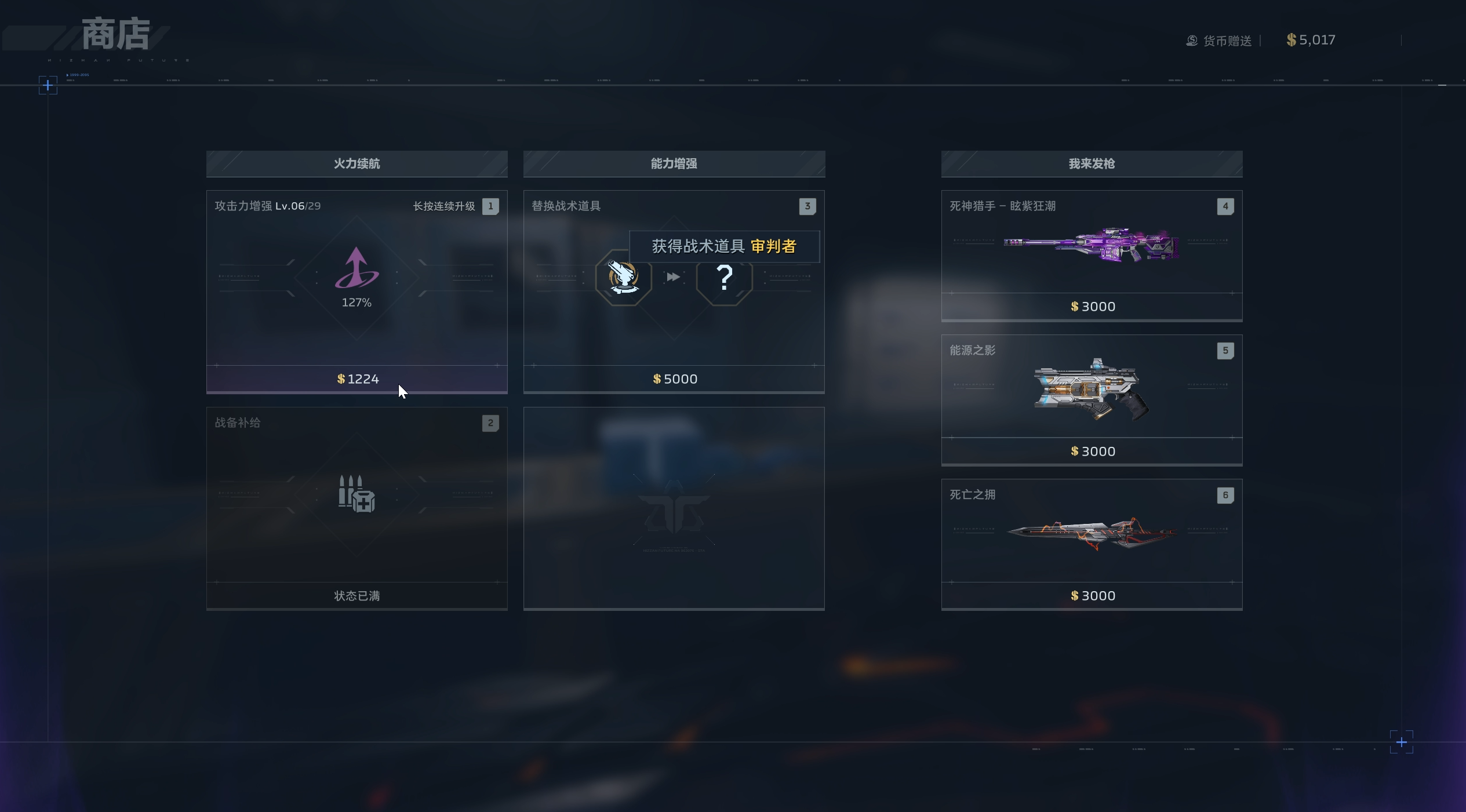 击败场上敌人,或开启宝箱,还会获得金币。金币可以打开商城界面随时购买战术支援,但最多装备三种战术支援,每种最多购买三次。