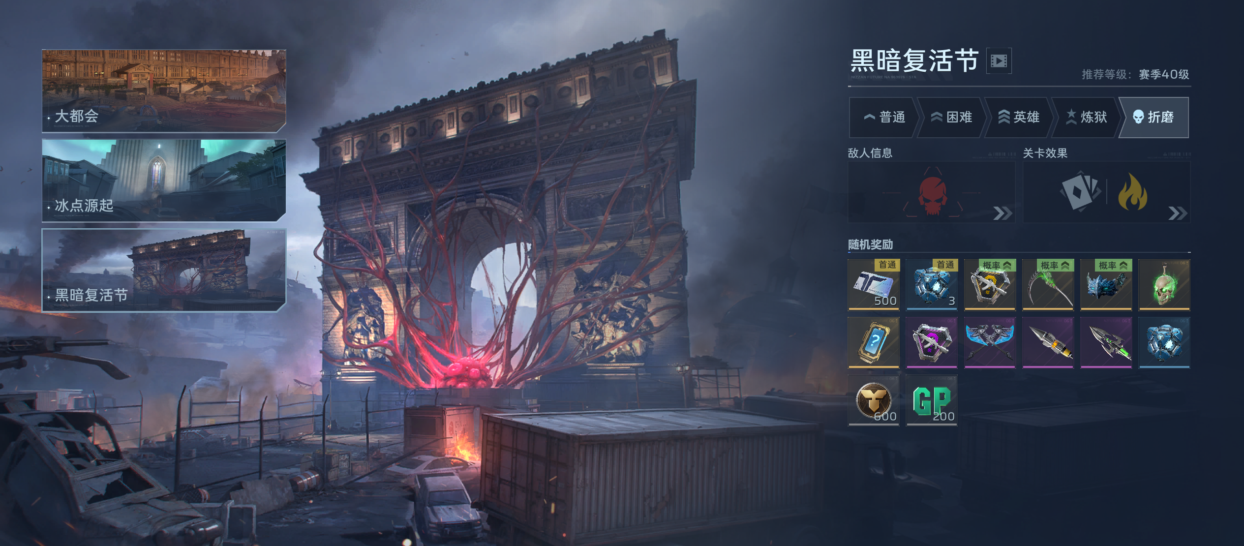 2、地图介绍:当前共有大都会、冰点源起、暗黑复活节三种地图,每张地图支持普通、困难、英雄、炼狱 折磨5种难度选择,难度越高,怪物越强,种类也越多,在折磨难度中,敌人还会有额外增幅效果。