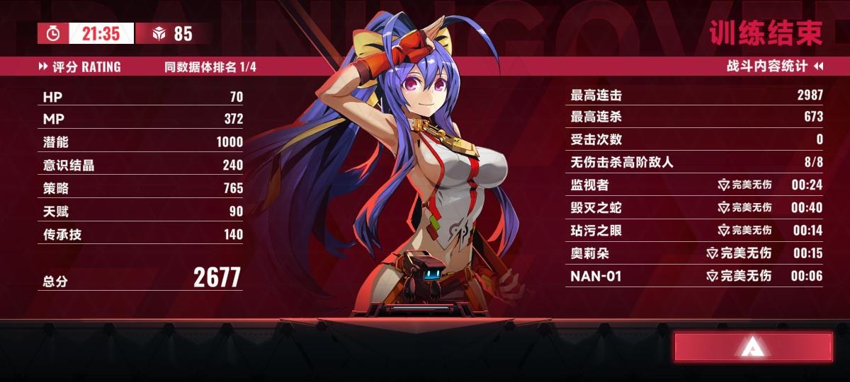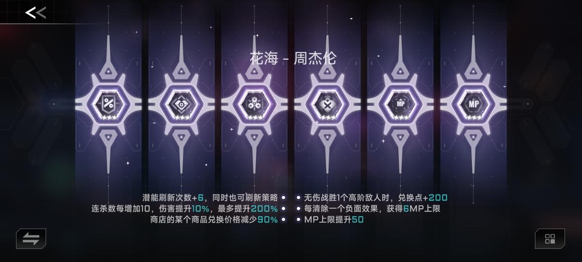 无伤击败高阶敌人获得200点兑换:无伤击败高阶敌人本身就有奖励机制,清除所有负面,并获得一个正面效果,在终极战斗之前,总共有,一到四图,一个boss,阿尔法空间可以打雷姬,跟两个获得潜能的boss,也就是总共七个都无伤的话,就是1400兑换点,如果对自己手法自信的话,这个是必带的,兑换点才是这个游戏最重要的资源(如果对自己手法不自信,可以换成死里逃生哦)