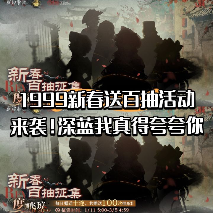 近日,在1月10日的新春特别版本前瞻直播中,重返未来1999官方正式宣布了备受期待的度朔飞琼限时征集活动,本次新春预热活动于1月11日上线玩家只需每日登录即可领取免费十连抽,并且玩家累计最多可获得100连抽,深蓝这么好的新春福利我真得夸夸你了![[TapTap表情|TapFamilyxdoro2_粉狗比心]](https://img-tc.tapimg.com/market/images/101c7e3200596fe8e03765080b467fb8.gif)