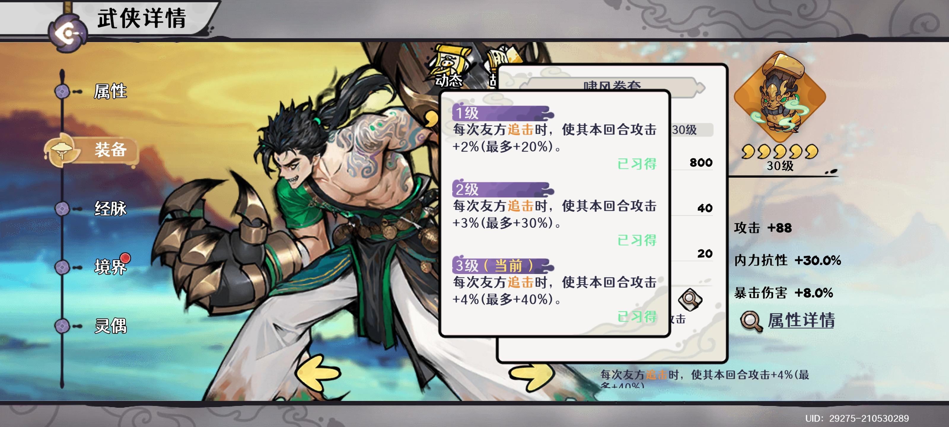 配阵队伍豪侠位主要是狂澜的神兵增攻40%。