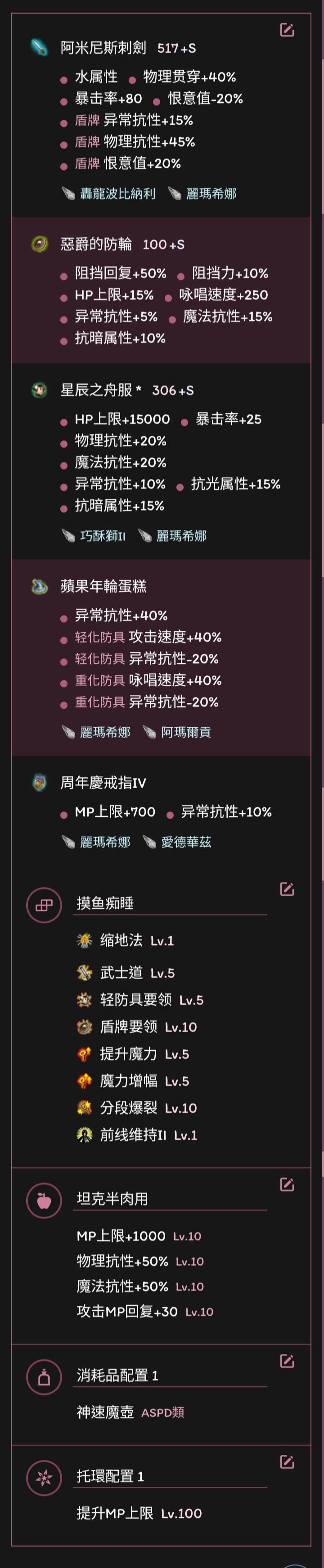 异抗清算:剑15、盾5(但凡有盾娘的盾系列)、防具10、丽玛希娜全装备共四孔3×5=15、追加40、戒子10。