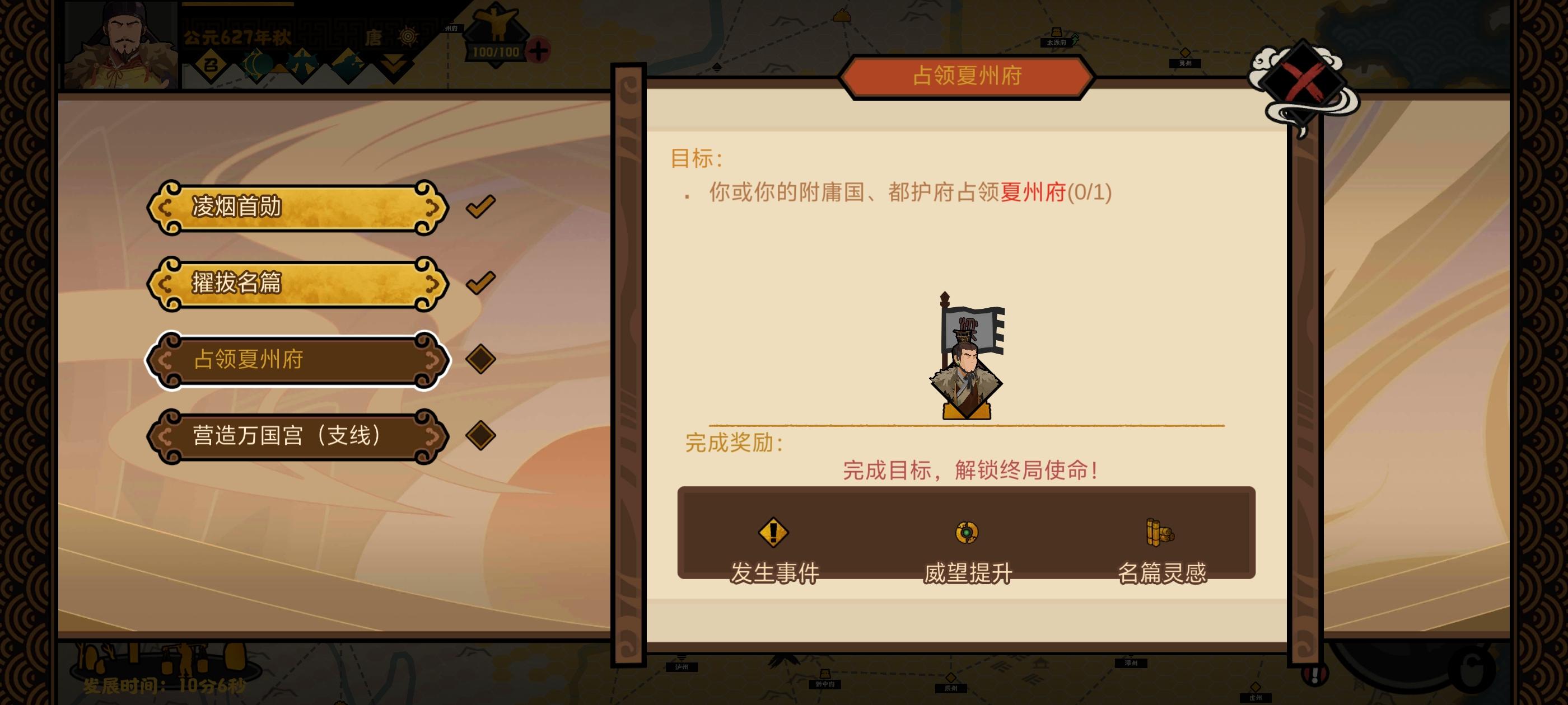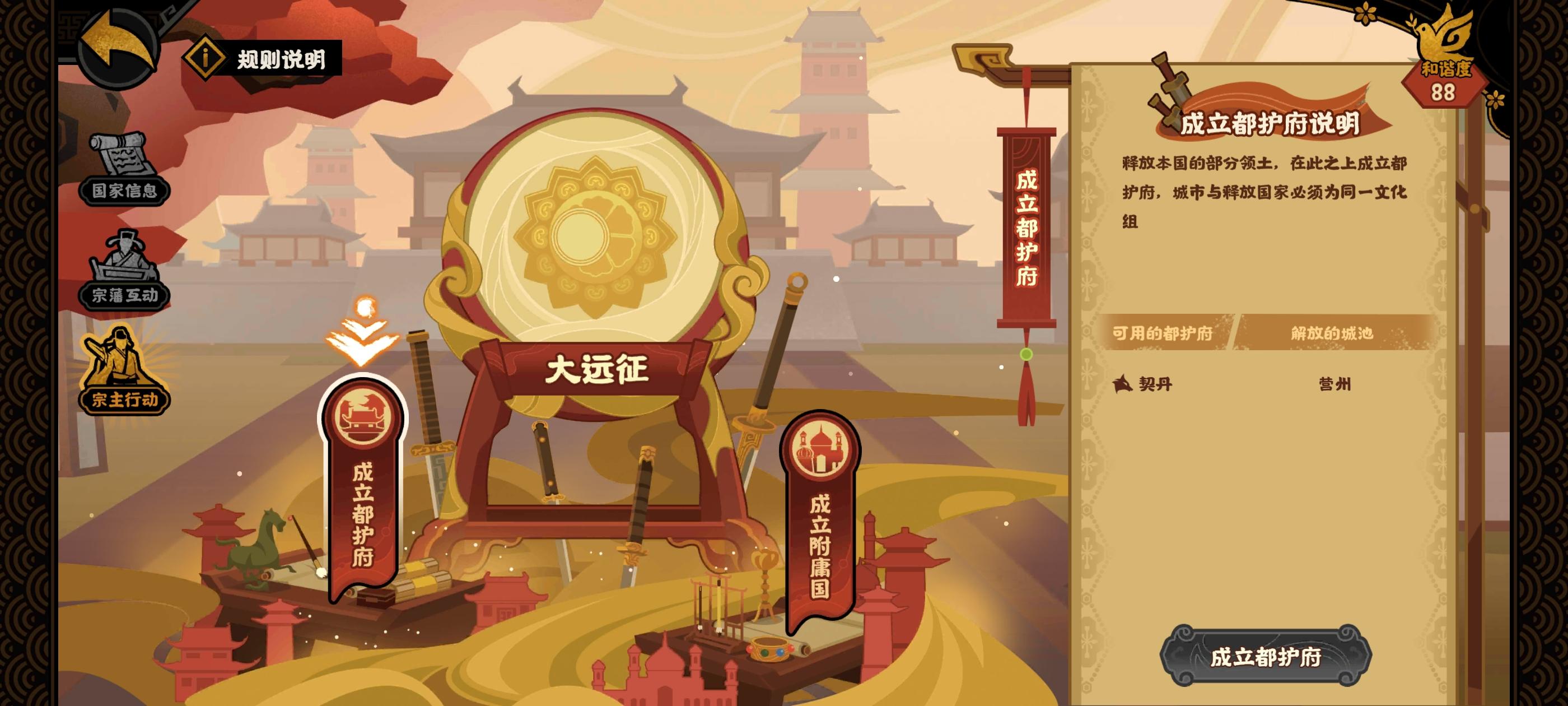 一个成立都护府一个成立附庸国,还有一个大远征,大远征没什么用,当然你喜欢的话可以去玩玩。我不推荐去拉关系让开局国家来当都护府,因为他物资上限太低了,因为以前王维的原因当时我发现放都护府他会继承你的一部分战斗力和军规,而且他的物资上限也很高当时有一千多上限,基本是用不完,不过正常中后期放一个都护府他也能有个一两百的上限,对比同时期的初始国家差距巨大。都护府这种东西用完物资补不上去就吃了换一个新的就行了。