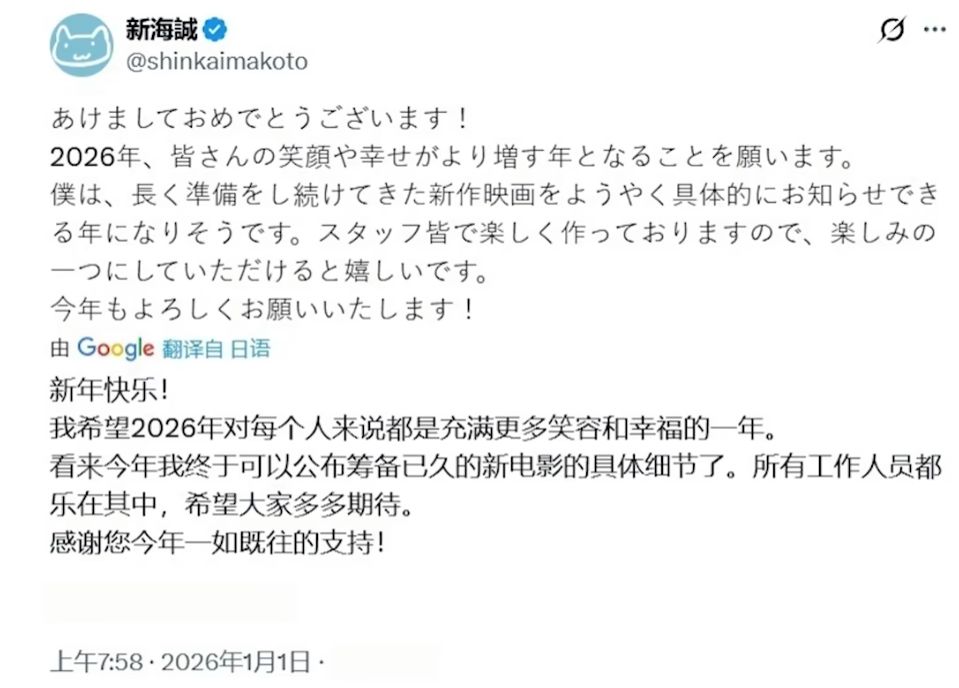 另外诚哥多年的战友,原画师西村贵世也提到自己参与了一个近两年的大制作,并且在2025年11月接近完成。如果我们暂定他说的就是诚哥新电影的话,那2026年上映倒也不是没有可能。