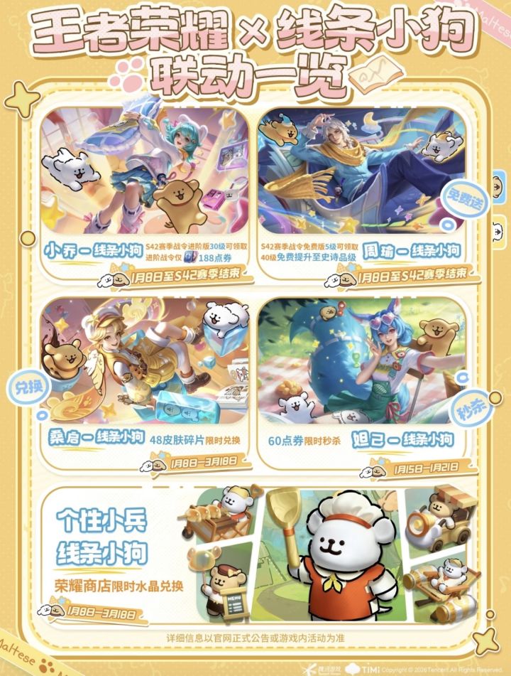 王者荣耀与线条小狗的联动活动已于2026年1月8日正式上线,带来多款治愈系皮肤和丰富福利。活动核心是S42赛季战令系统,周瑜-线条小狗皮肤可通过免费战令5级领取,40级可免费进阶为史诗品质;小乔-线条小狗皮肤需188点券开通进阶战令,30级即可领取史诗品质。此外,桑启-线条小狗皮肤支持48皮肤碎片兑换,妲己-线条小狗皮肤开启60点券限时秒杀。联动还包含元流之子时装、个性小兵等道具,以及免费称号、头像框等奖励。活动将持续至S42赛季结束,部分兑换内容截止至3月18日 #王者荣耀 #线条小狗 #王者荣耀联动线条小狗 #今天游戏圈发生了啥 #王者荣耀世界