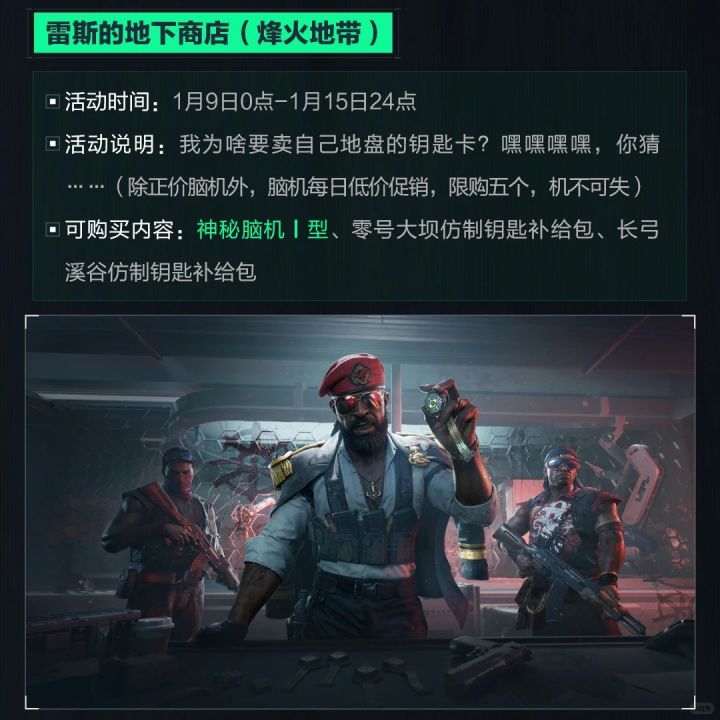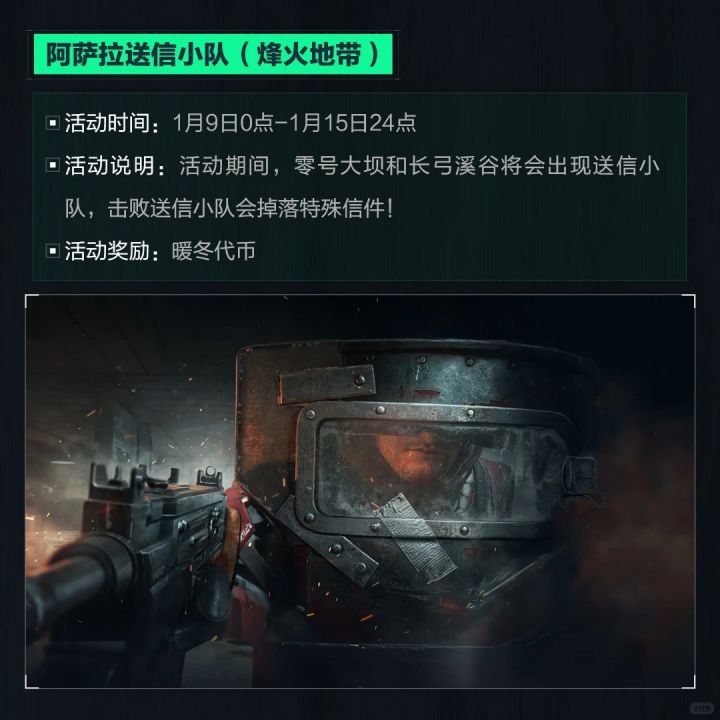 2.新活动扎堆上线!1月9日-1月15日零号大坝和长弓溪谷会出现「阿萨拉送信小队」,也是类似哈夫克巡逻队的任务,等后续更新一下点位,击败就能掉特殊信件,兑换暖冬代币超轻松~