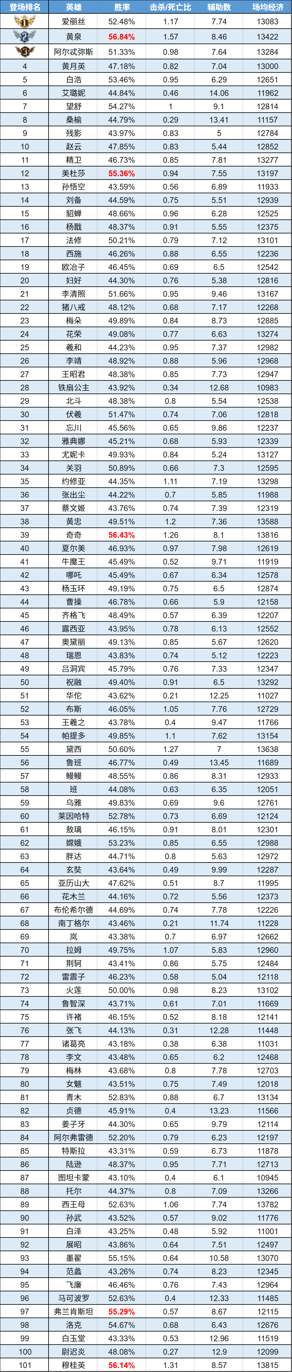 排序:按登场率高低排序,标红为胜率前5