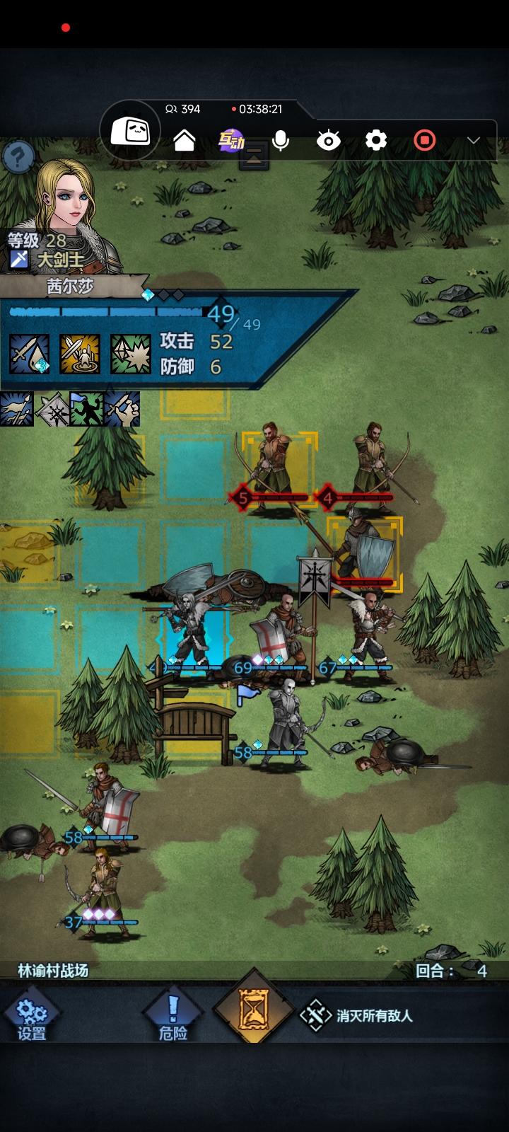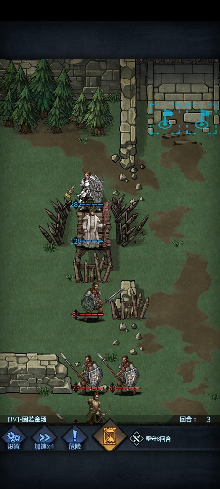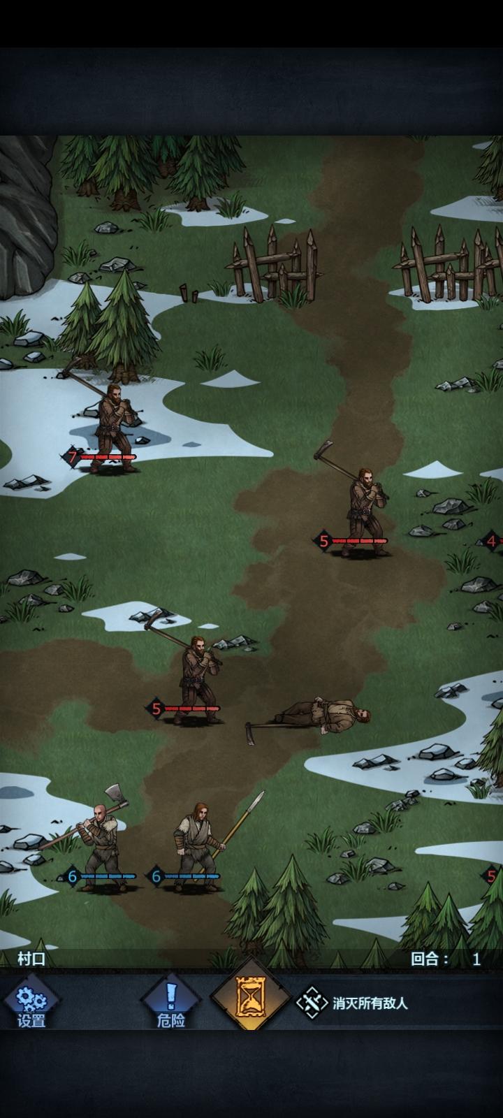 首先是村口,界面简洁,点击危险可以看到对面能攻击到的范围,点击自己可以看到自己的攻击范围,简单来说,就是让对面进入你的攻击范围,你先手攻击就占优势。正常情况近战每回合都有一次反击机会,远程则没有。点击沙漏跳过回合,有时候不动跳过回合是让对面进入自己攻击范围
