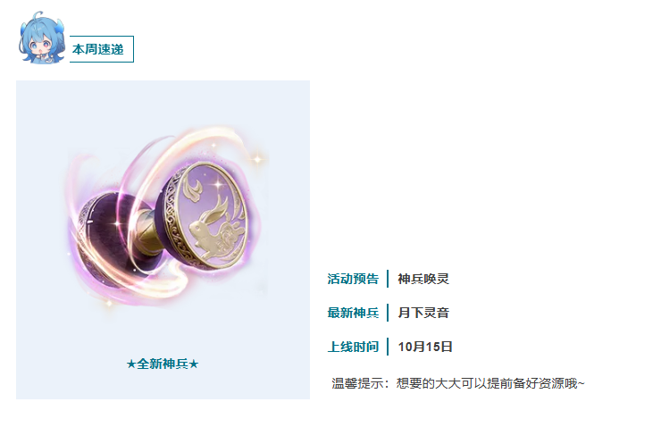 本周最大看点:新神兵即将上线+周一礼包~
