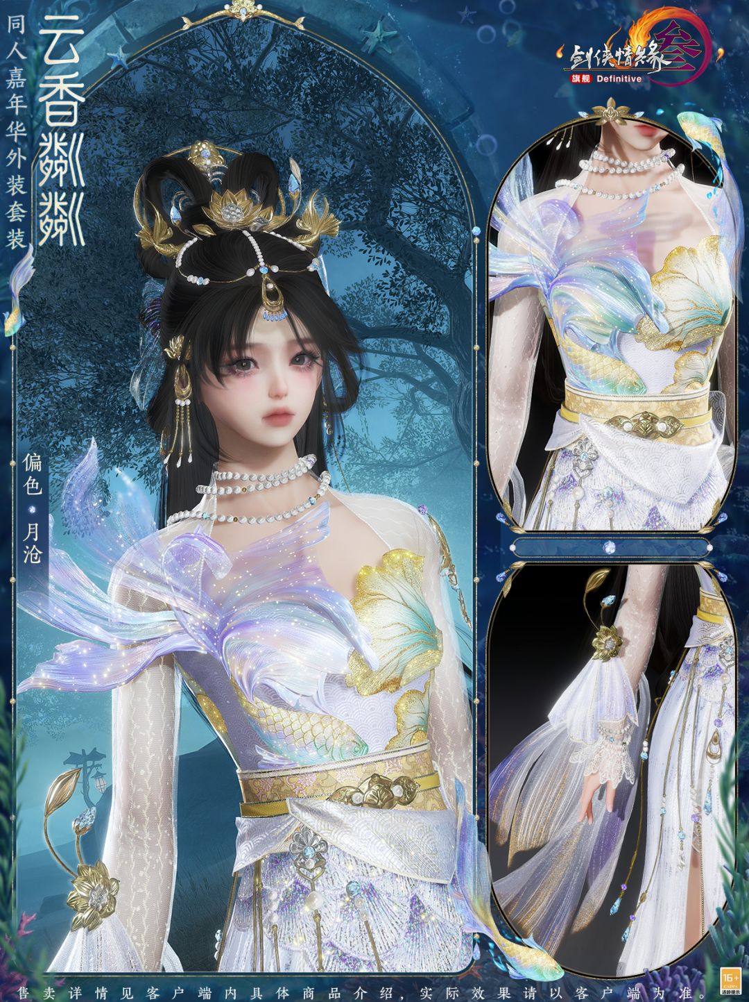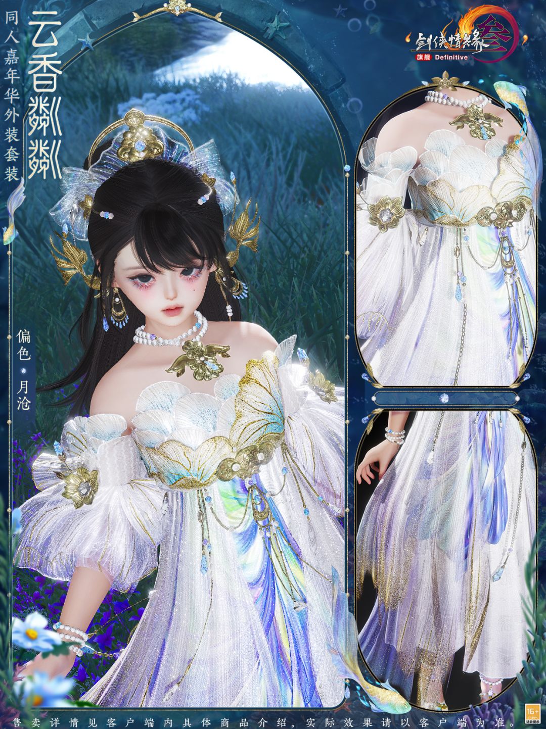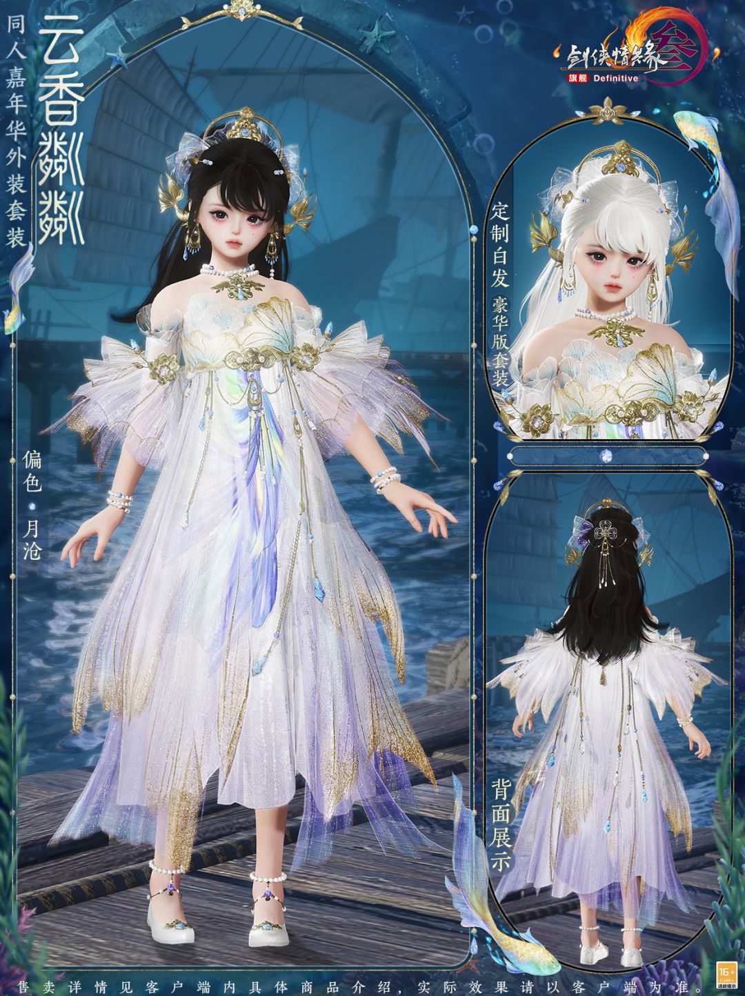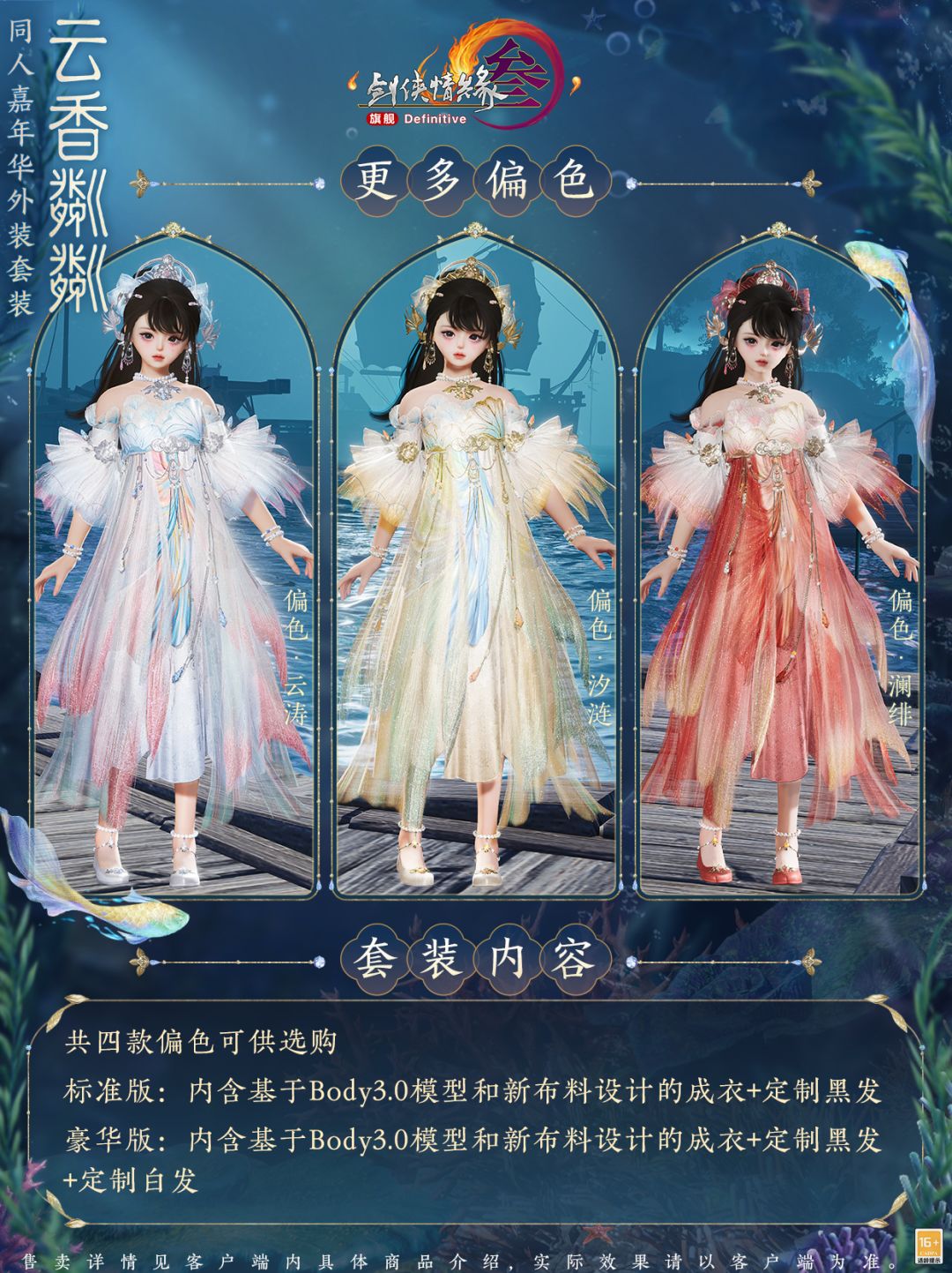 漱玉浮光,风动银涛漾碎霞,全新同人外装套装“云香粼粼”取意鱼群飞跃惊扰波光的景象,共四款偏色,豪华版礼盒另含定制白发。裁渐变轻纱为裳,衣间流光晕染虹霓,裙裾轻旋如游鱼跃波,锦鳞缀饰,天河坠晶作明珰。