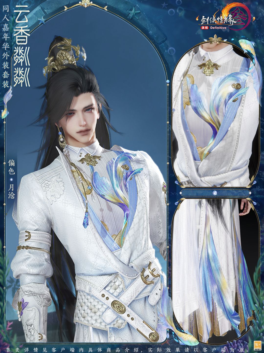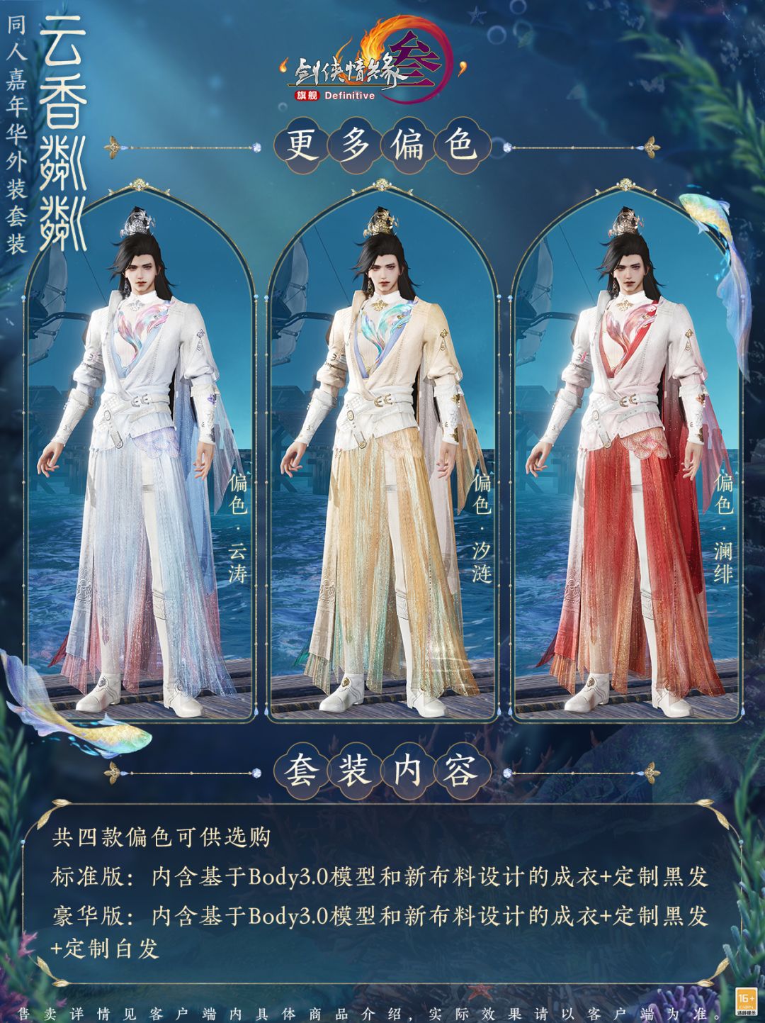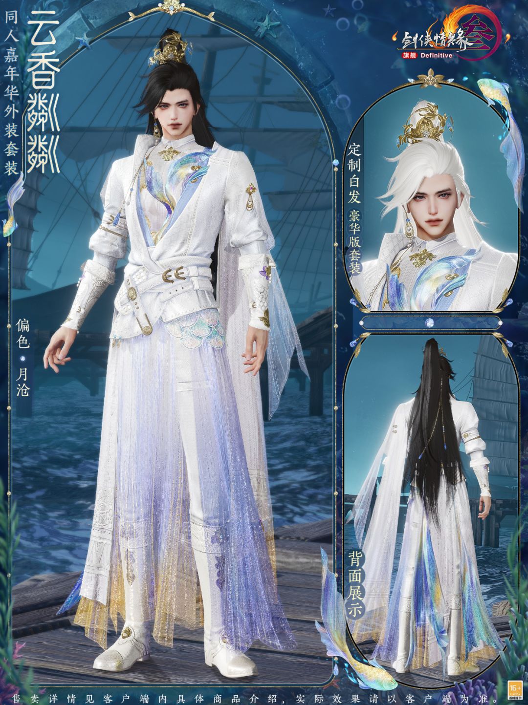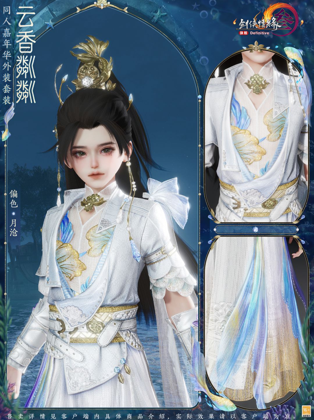 漱玉浮光,风动银涛漾碎霞,全新同人外装套装“云香粼粼”取意鱼群飞跃惊扰波光的景象,共四款偏色,豪华版礼盒另含定制白发。裁渐变轻纱为裳,衣间流光晕染虹霓,裙裾轻旋如游鱼跃波,锦鳞缀饰,天河坠晶作明珰。