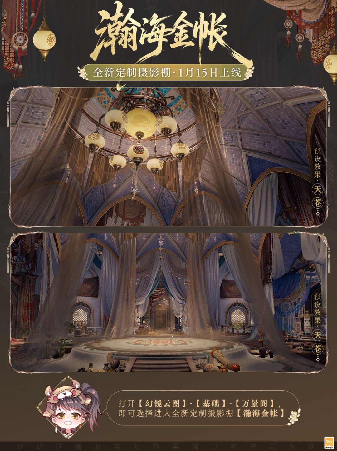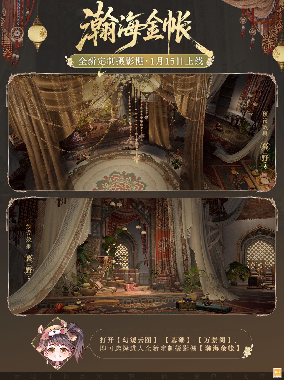 万景阁全新定制摄影棚“瀚海金帐”同步上线,步入其间,目之所及皆为匠心雕琢的精致陈设,明丽的色系碰撞更显富丽堂皇。层叠绸缎垂作暖香帐,璎珞流苏错落悬挂,暗香悠悠,可切换“天苍”与“暮野”两种光影色调,打造层次丰富的视觉盛宴!