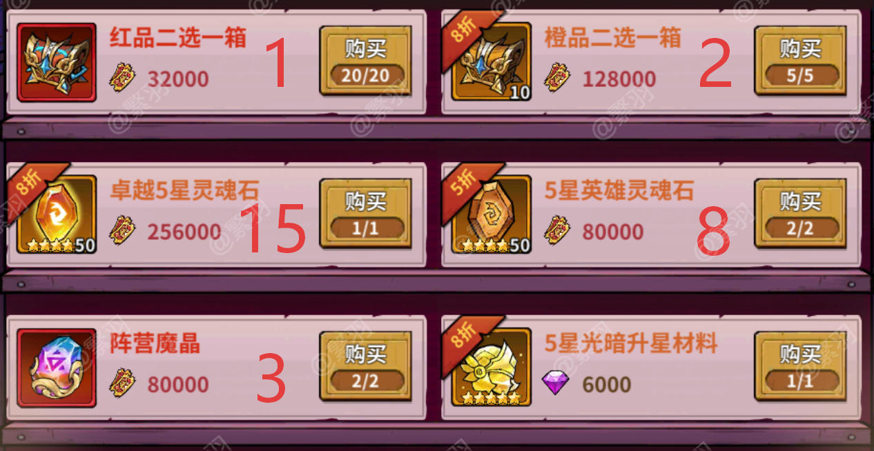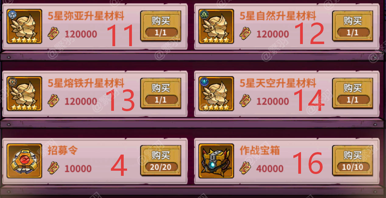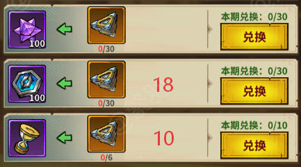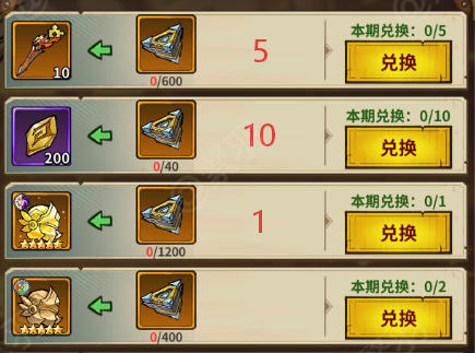 顾名思义活动持续一周,每周都有,周周轮换,这游戏周活动是每个服独立的,不是全服拉通,所以不同服之间会出现活动不一样的情况。游戏里一共有三种周活动,分别是堡垒主题,契物主题,纹章主题。下图中的数字,表示兑换次数,钻石商店前期只建议购买符印,觉醒石,精炼石,以及堡垒主题中的堡垒招募道具。