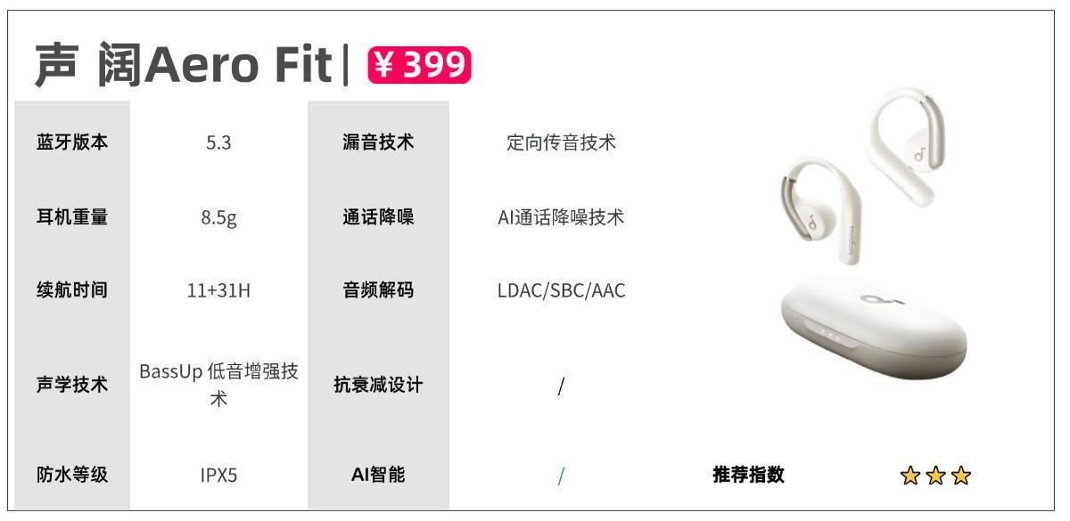 其他方面:小米开放式耳机搭载了超线性发声单元,配合DLC振膜,加强声音表现,实现调节高、中、低三种音频,让声音表达出色。此外新增独立防漏音发声单元,提高音听音的私密性,守护听音安全。其他配置方面,小米开放式耳机支持蓝牙5.3版本,让设备之间连接更加稳定、迅速,日常使用场景下延迟控制得当,而且能与大部分设备兼容。另外,续航方面也还不错,单体耳机续航时长有7.5h,配合充电盒使用续航可达38.5h。除此以外,小米开放式耳机还能够做到小米澎湃OS生态互联,多个设备流转,开放式耳机推荐三:声 阔Aero Fit参考价格:399元推荐理由:云感舒适佩戴,贴合不同耳廓机型亮点:单只耳机重量约为8.5g,耳机符合人体工学仿真设计,云感佩戴更舒适,牢牢贴合不同耳廓。搭载Bass Up 低音增强技术,模拟空气自然流动的态势让声音更动听。蓝牙版本5.3,满足大部分蓝牙设备连接,同时也搭配闪充技术,续航能力出色。