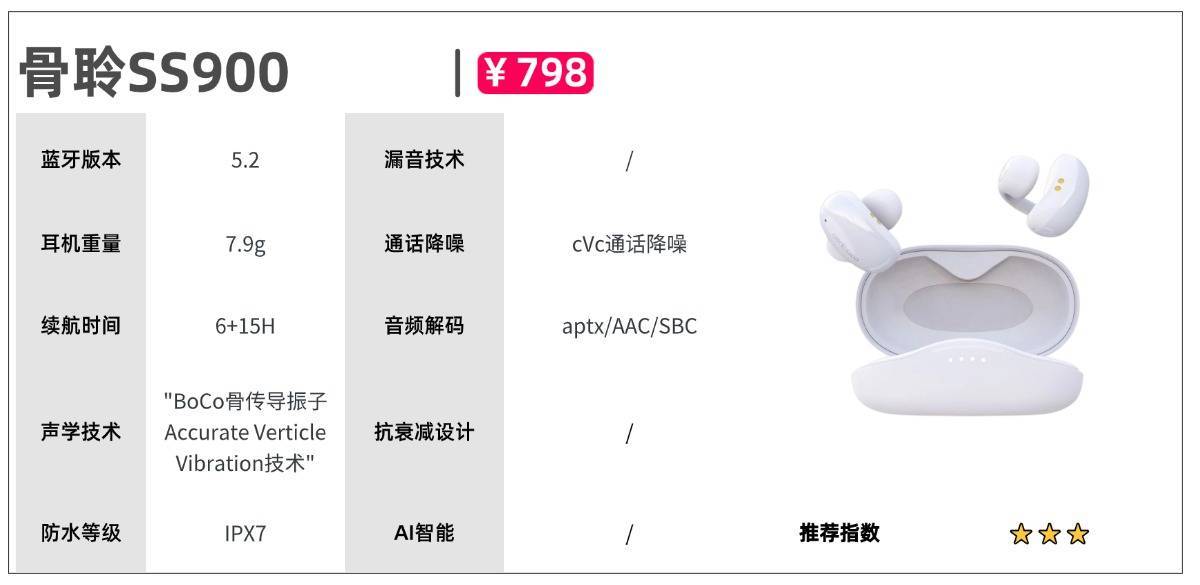 其他看点:声阔AeroFit 搭配BassUp 低音增强技术,通过模拟空气自然流动的态势,让声音更加出彩动听。同时具备3D环绕立体声,定向聚声技术,精准高效传声,提高通话私密性。 支持蓝牙5.3版本,设备连接快速、高效,日常使用场景下延迟控制得当,而且能够与大部分设备兼容。续航方面,单耳最高续航11h,搭配充电仓使用达到42h超长续航,同时搭配能量闪充技术。开放式耳机推荐四:骨 聆SS900参考价格:988元推荐理由:弹性夹持弯臂佩戴舒适,防漏音效果明显机型亮点:搭载自研振子与PreciseAir 3.0技术,在保证开放双耳、零耳道压迫的前提下,显著优化了低频表现并抑制漏音。它通过弹性夹持结构实现稳固佩戴,单只耳机重量7.5g,日常长时间佩戴基本没有什么问题。