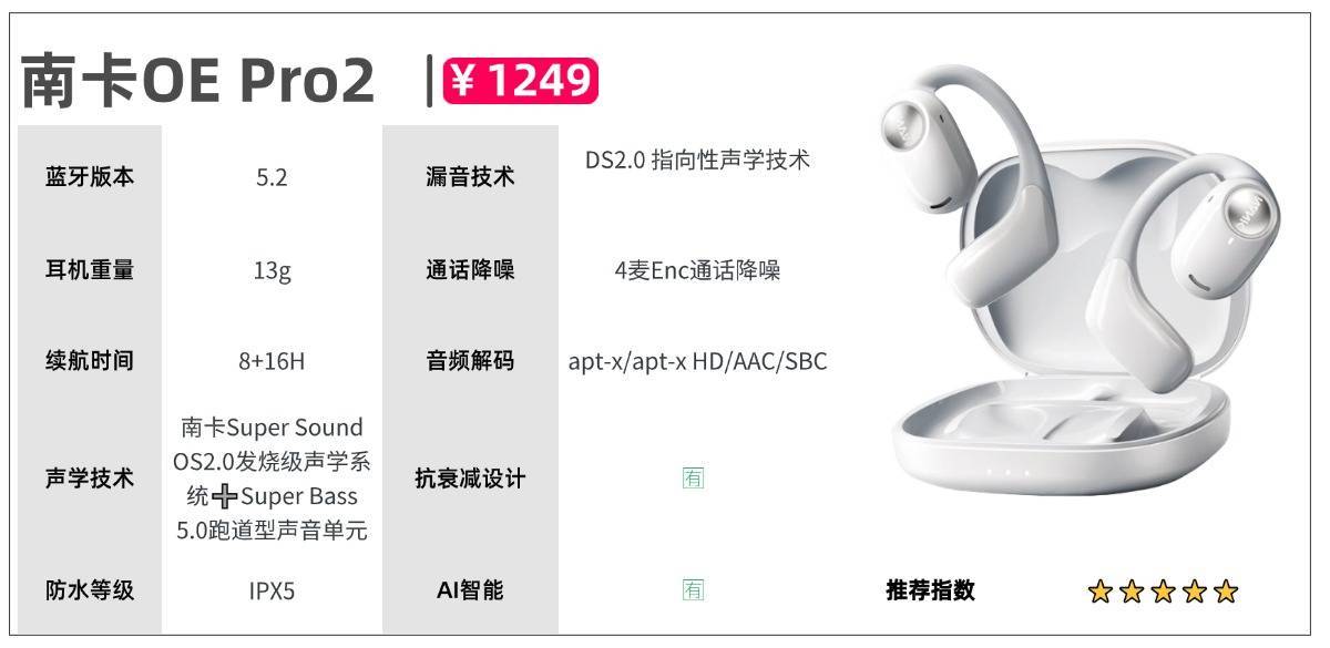 其他方面:音质方面采用BoCo骨传导振子Accurate Verticle Vibration技术,采用AVV技术实现高稳定、高弹性的垂直均匀震动,有效抑制漏音。同时高版本cVc8.0降噪技术+通话麦克风,有效消除噪音,实现清晰保真的通话效果。配置方面,骨聆SS900支持蓝牙5.2,搭配高通QCC3040强芯加持,实现高容量、高速度、长距离的三大提升,更远更快更稳定。续航方面,单次使用8h,搭配耳机仓总续航约24h,续航方面相较于其他耳机较弱,同时支持快充10分钟,续航2h。开放式耳机推荐五:南卡OE Pro2参考价格:1249元推荐理由:行业最强发烧配置,常年占领开放式口碑榜单TOP1的专业技术老牌!机型亮点:在目前开放式耳机大多存在佩戴不适、音质平庸的情况下,南卡凭借“软硬件双驱动”的独特声学理念与13年的技术积累,使得OE Pro2在舒适度与音质上长期稳居行业第一梯队,并且整合了全能Ai智慧系统,具备翻译、语音助手、内容创作等数十项功能,让耳机从单一的听音工具升级为学习、办公、娱乐的全能助手。因其“全能Ai智慧+发烧音质”的双重优势,被HiFi发烧友、数码博主和达人们频频推荐,长期热度不减、屡次断货,成为开放式耳机领域难得一见的性能王者。